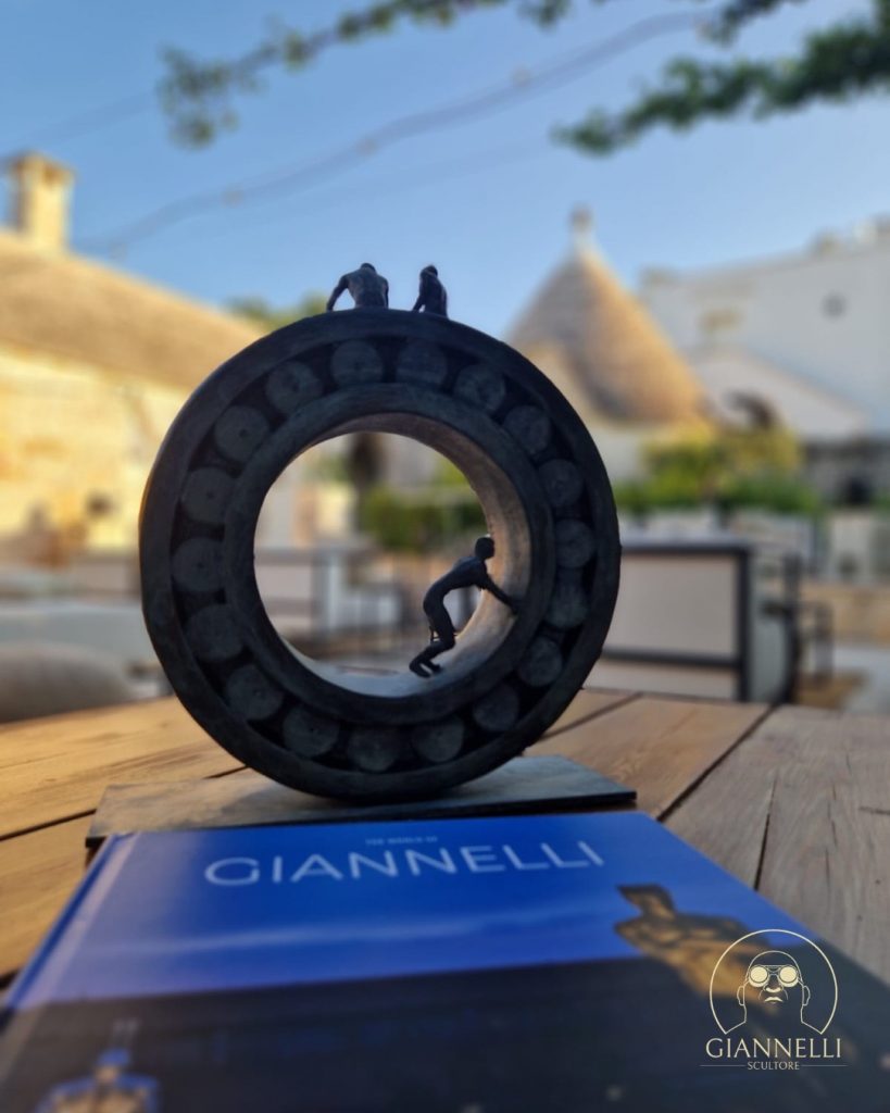 Nel paesaggio del Leonardo Trulli Resort, tra muretti a secco, uliveti e architetture ancestrali, le sue sculture si pongono in ascolto, non impongono ma dialogano. È qui che l’uomo, carico della memoria industriale e urbana, ritrova una possibilità di senso nel confronto con la natura.