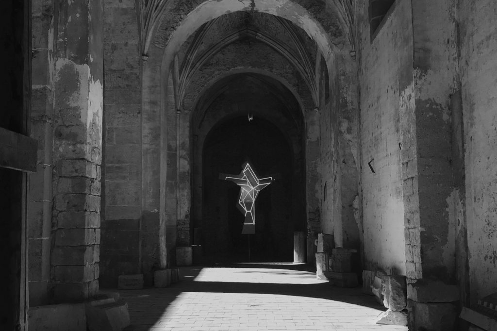 L’opera, progettata proprio per la Chiesa di Santa Maria dello Spasimo, si lega a doppio filo con il capolavoro di Raffaello, lo “Spasimo di Sicilia” (1517), oggi custodito al Prado di Madrid ma originariamente destinato alla chiesa palermitana. La dolorosa salita al Calvario, descritta con grande intensità dall’artista urbinate, si converte in una figurazione estremamente sintetica. Un incrocio destrutturato di bianchi volumi rievoca la forma del corpo sofferente del Christus Patiens e diviene schermo per la visione drammatica della Passione, che si eternizza nel tempo presente mettendo a nudo un conflitto umano e sociale in cui il tempo sembra arrestarsi, retrocedere e poi riprendere forma.