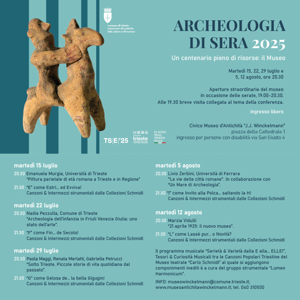 Con l'appuntamento di domani, martedì 15 luglio, prende il via al Museo d’Antichità “J.J. Winckelmann”, l'edizione 2025 di “Archeologia di Sera”, la rassegna che tradizionalmente offre al pubblico, nell'ambito del cartellone di Trieste Estate, occasioni di divulgazione e approfondimento su temi archeologici legati alla collezioni del Museo. Sono cinque gli appuntamenti di questa edizione, che celebra il centenario dell'allestimento del Museo nella sede di via della Cattedrale, per altrettanti martedì, dal 15 luglio al 12 agosto, tutti con inizio alle ore 20.30, ad ingresso libero nella suggestiva cornice del Giardino del Capitano e con accesso da Piazza della Cattedrale.