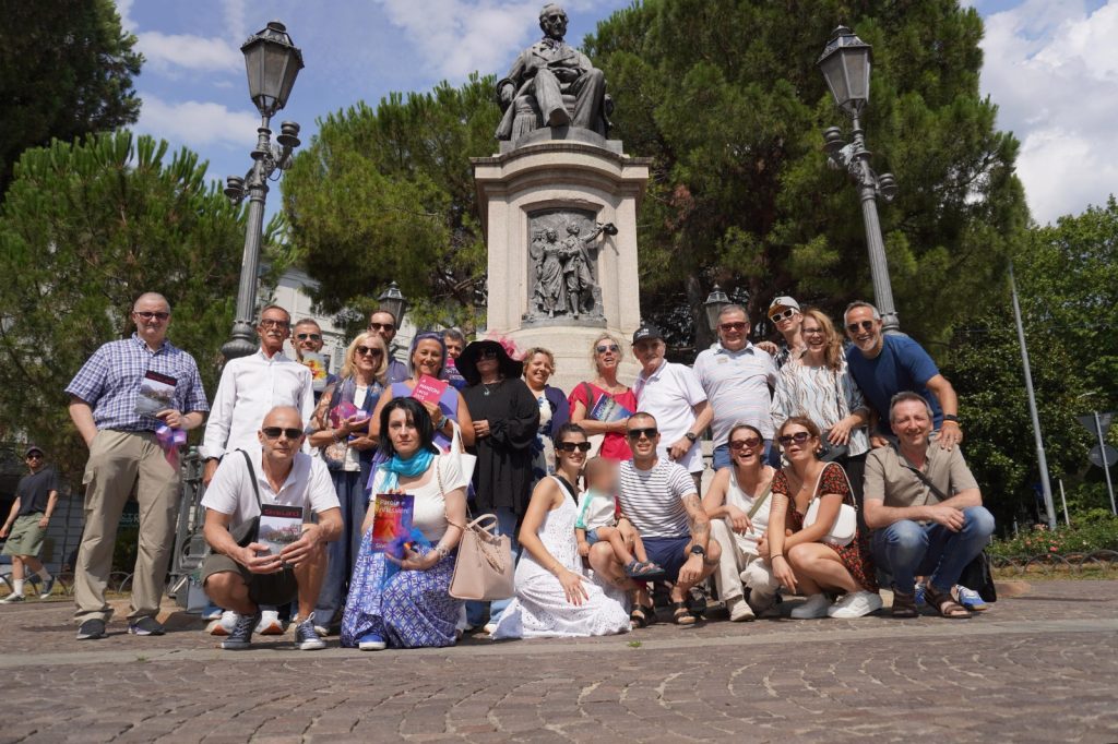 Un gruppo consolidato di artisti, parenti e collaboratori della scrittrice Silvia Landi, abbracciati dall’imponente scultura che rappresenta Alessandro Manzoni con il libro “I Promessi Sposi” in Piazza Manzoni a Lecco, in uno scatto fotografico apreno la VII edizione di INCONTEMPORANEA 2025 LECCO.