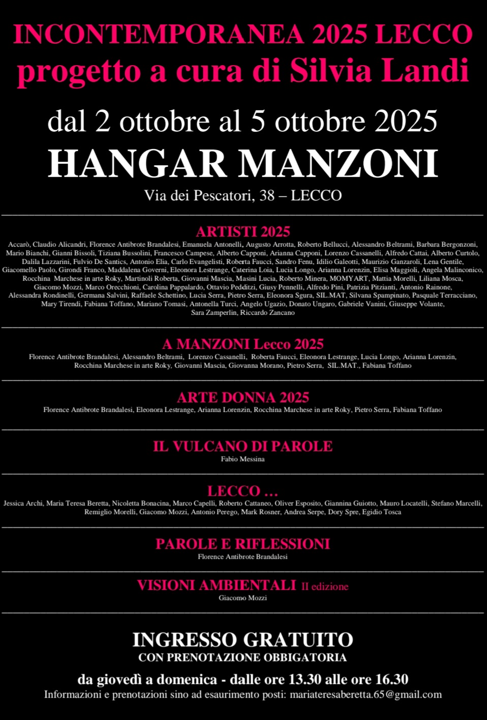 INCONTEMPORANEA 2025 Lecco è un progetto a cura di Silvia Landi, dal 2 al 5 ottobre 2025 presso Hangar Manzoni, con presentazione dei libri d’arte: “Artisti 2025”, “Lecco …”, “Parole e riflessioni – Florence Brandalesi”, “Visioni ambientali - Giacomo Mozzi”, “Il Vulcano di parole – Fabio Messina”. Inoltre il progetto include una sezione espositiva di opere d’arte che illustrano due libri. “A. Manzoni Lecco 2025” e “Arte donna 2025”. Numerose presenze durante i quattro giorni della kermesse con interventi degli artisti inseriti nei libri realizzati da Silvia Landi e la partecipazione del giornalista e fotografo, Giacomo Mozzi e dell’ingegnere e genealogista, Fabio Messina e della compagna di vita l’artista, Florence Antibrote Brandalesi.