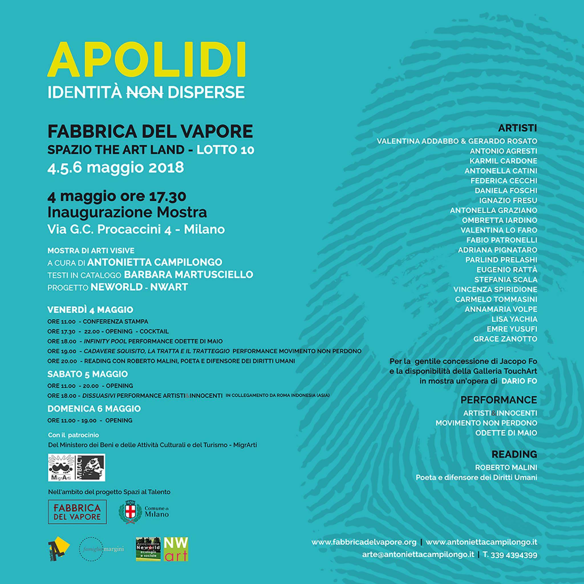 Venerdì 4 maggio 2018 alle ore 17.30 si inaugura, presso la Fabbrica del Vapore – Spazio The Art Land – lotto 10 a Milano, la mostra dal titolo: Apolidi | Identità non disperse.