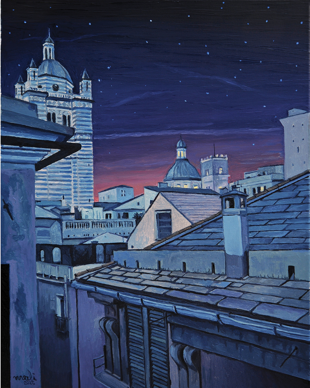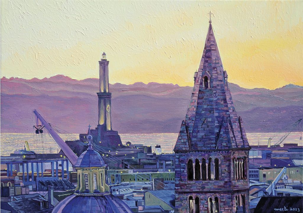 Mostra d'Arte collettiva tra cui Enrico Merli: La straordinaria sensibilità per la luce e per il colore è il carattere distintivo della pittura di ENRICO MERLI . I suoi paesaggi, grazie alla sapiente calibratura degli effetti cromatici e luminosi, si trasformano in luoghi del cuore, in emozioni interiori rivissute con struggente nostalgia. Per Merli, la luce non è un fenomeno fisico, ma viene utilizzata come strumento per esprimere emozioni e sensazioni, rendendo la sua pittura un viaggio nell'esperienza lirica e percettiva. Genova testimonia l'affinità elettiva di Merli verso la sua città, osservata nell'ora commovente del tramonto dove le forme diventano ovattate presenze, trasfigurate nel cuore di un'anima innamorata. La magia del colore domina a Genova (da Palazzo Giustiniani) in cui il ritmo verticale delle torri, delle cupole, dei camini conduce l'occhio verso il cielo stellato che diffonde il suo manto blu sulla città, in una poetica armonia cromatica.