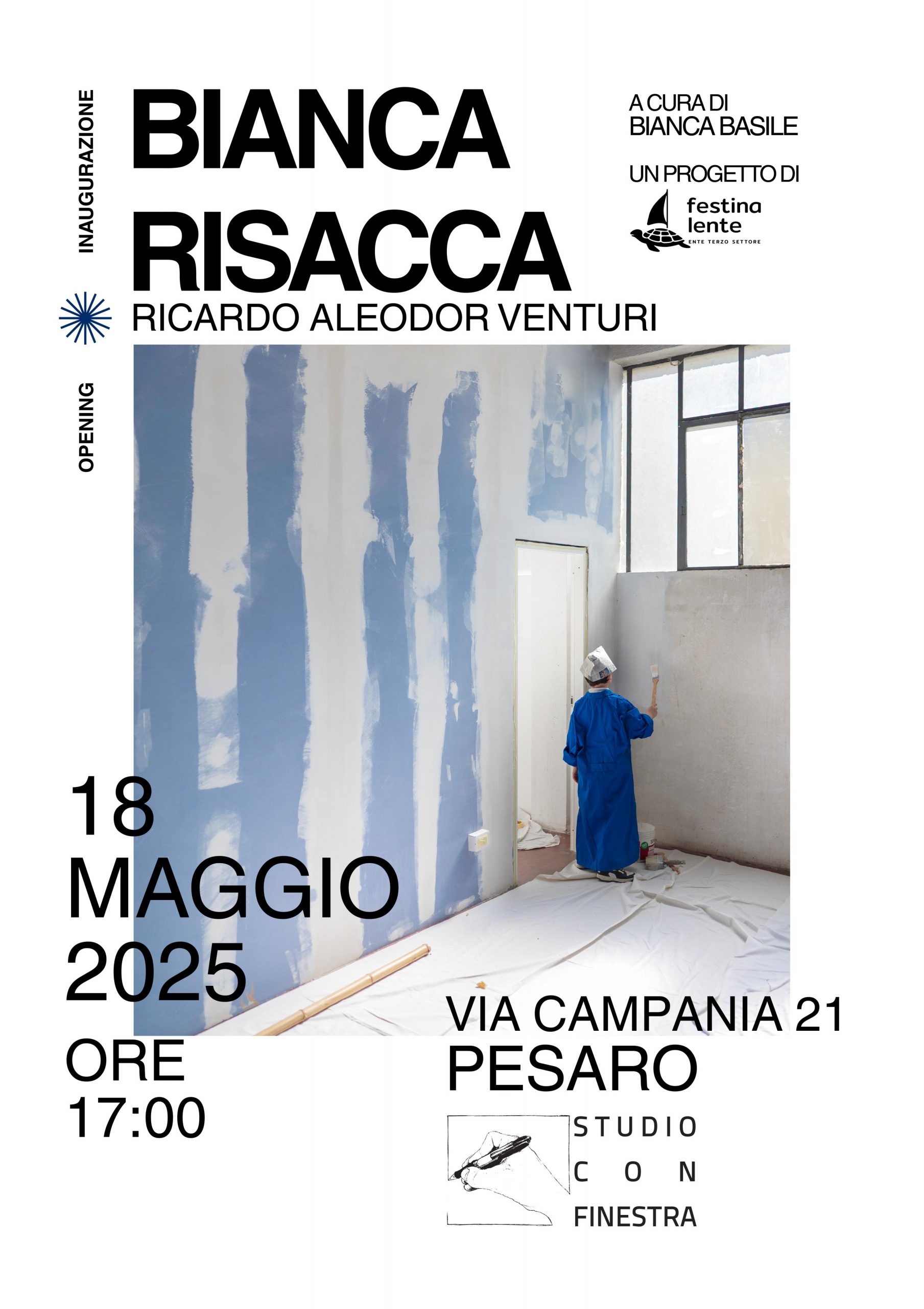 L’Associazione Festina Lente ha il piacere di comunicare che domenica 18 maggio 2025, alle ore 17.00, sarà inaugurato Studio con finestra, in via Campania, 21 (Pesaro) con la mostra personale Bianca risacca dell’artista Ricardo Aleodor Venturi (Pesaro,1994), a cura di Bianca Basile (Catania, 1995).