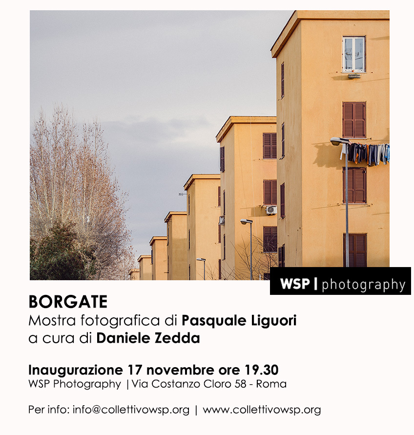 Venerdì 17 novembre alle ore 19:30 inaugurerà presso la sede del WSP photography, in via Costanzo Cloro 58, “BORGATE”, la mostra fotografica di Pasquale Liguori a cura di Daniele Zedda. Sarà presente l’autore che illustrerà la genesi e la storia del lavoro: un viaggio nelle borgate stimolato dal desiderio di esplorare una Roma autentica, non appariscente.
