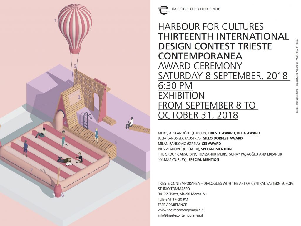 Sabato 8 settembre 2018 alle ore 18.30 presso lo Studio Tommaseo si terrà la cerimonia di premiazione in concomitanza con l'apertura della mostra delle opere vincitrici del Tredicesimo Concorso Internazionale di Design Trieste Contemporanea, dedicato ad "Harbour for Cultures", progetto biennale che Trieste Contemporanea sta dedicando alle possibili dimensioni sociali e culturali di un'immagine di un nuovo “porto di culture”, a partire dall’attuale dibattito sulla riconversione reale del Porto Vecchio di Trieste.