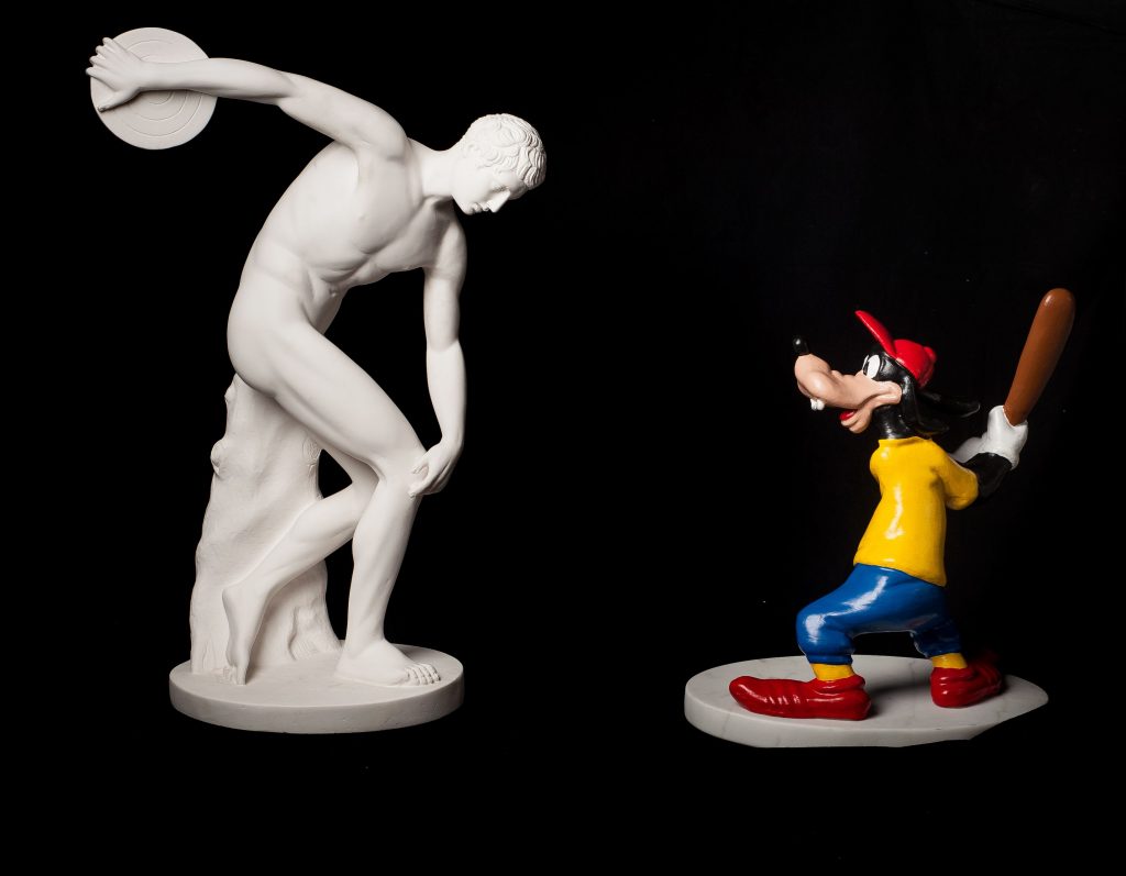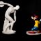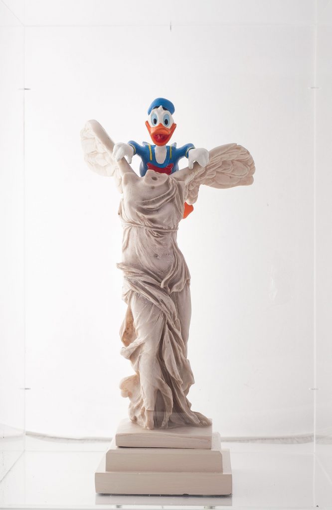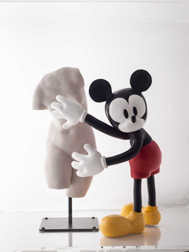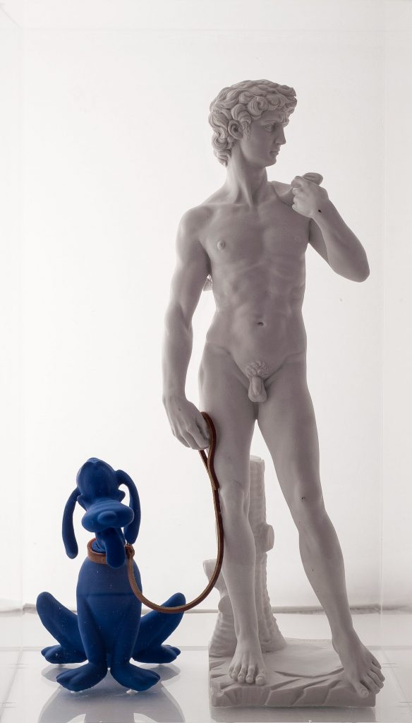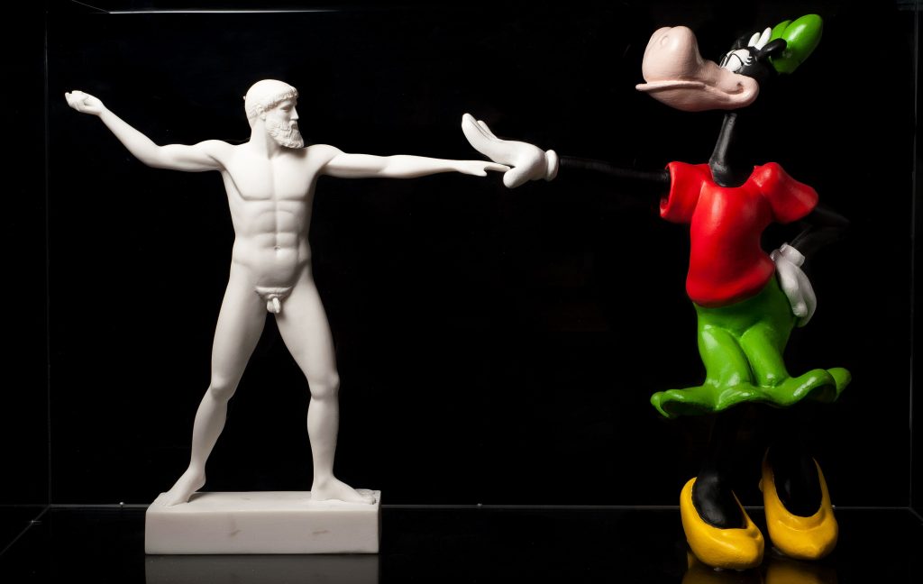 Così il David di Michelangelo per una volta tiene al guinzaglio un Pluto blu Klein, Poseidone balla con Clarabella, Lacoonte si fa dominare da Minnie e così via in 14 “irregolari” accostamenti.