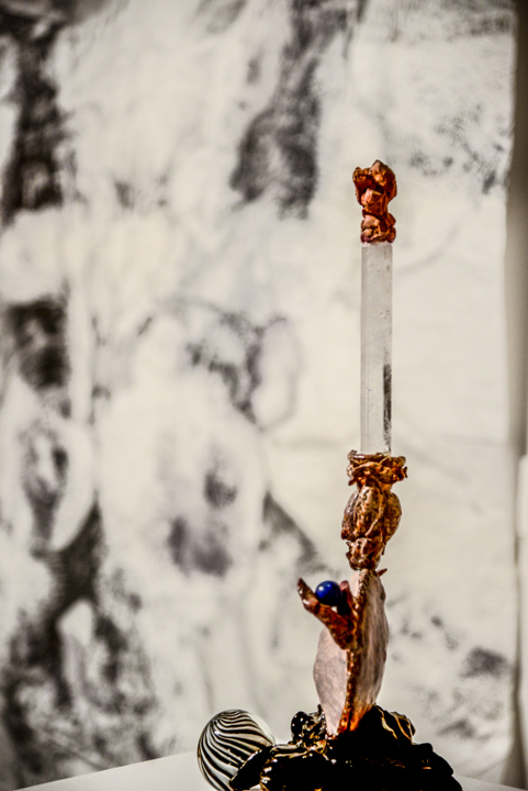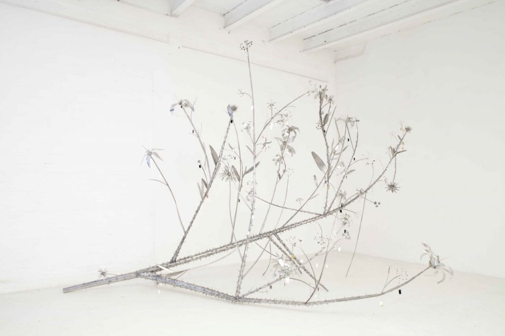 Il focus centrale dell’esposizione è rappresentato da delle imponenti strutture vegetali, l’installazione metallica Crocefissione Grunewald di Francesco Bocchini e una serie di carte di grandi dimensioni di Giovanna Caimmi.