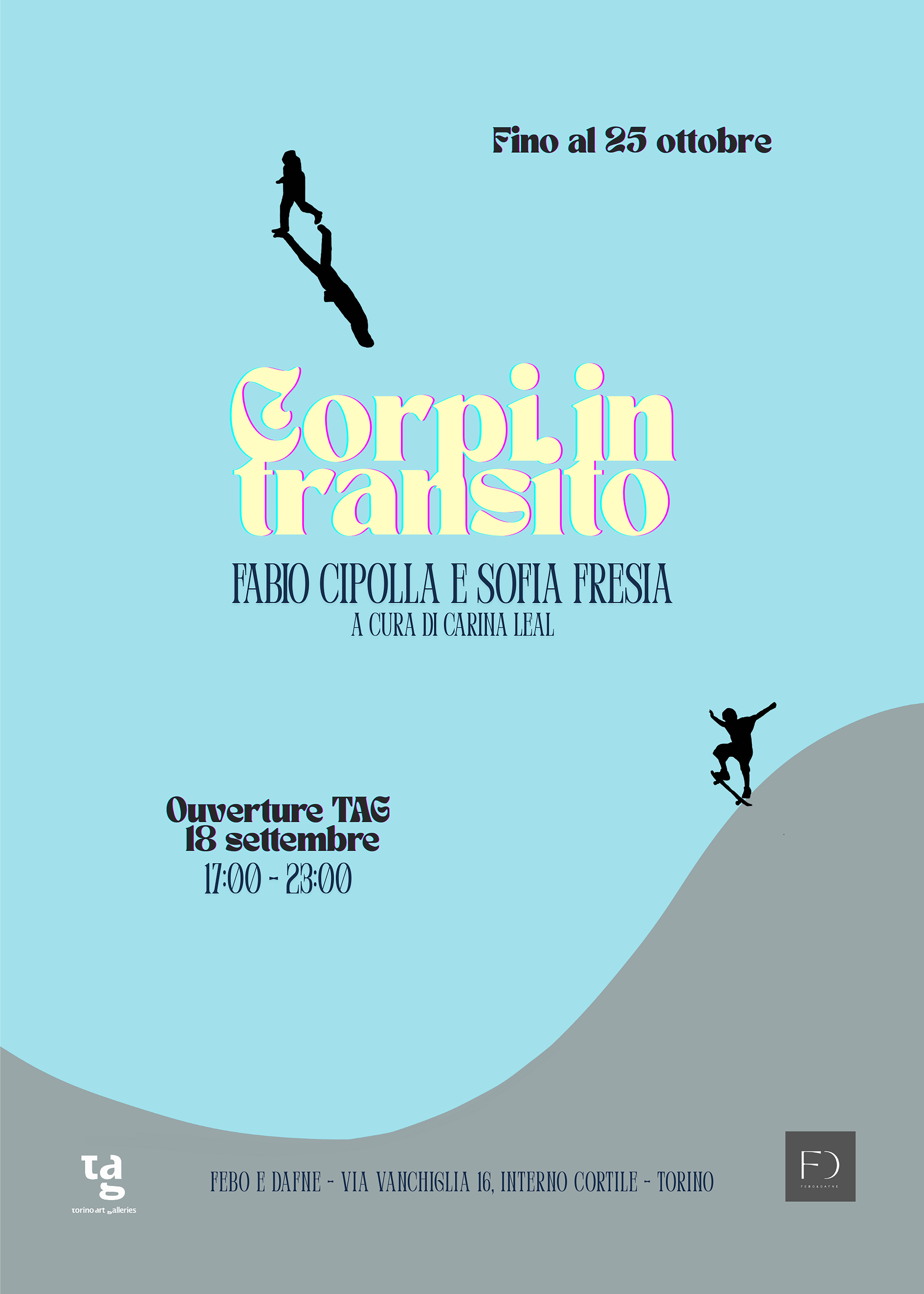 Dopo la pausa estiva e per questa edizione di Ouverture TAG, la Galleria Febo e Dafne è lieta di presentare la mostra Corpi in transito, una bipersonale di Fabio Cipolla e Sofia Fresia, a cura di Carina Leal. Corpi in transito nasce dall’incontro tra due pratiche artistiche - pittura e scultura - dove entrambe riflettono sul rapporto tra corpo e spazio, attraverso l’elemento chiave in comune - le piscine vuote. Questo rapporto si costruisce attorno a una comune tensione: quella tra solitudine e condivisione, tra l’individuo e la collettività, tra il nuoto e lo skateboard.
