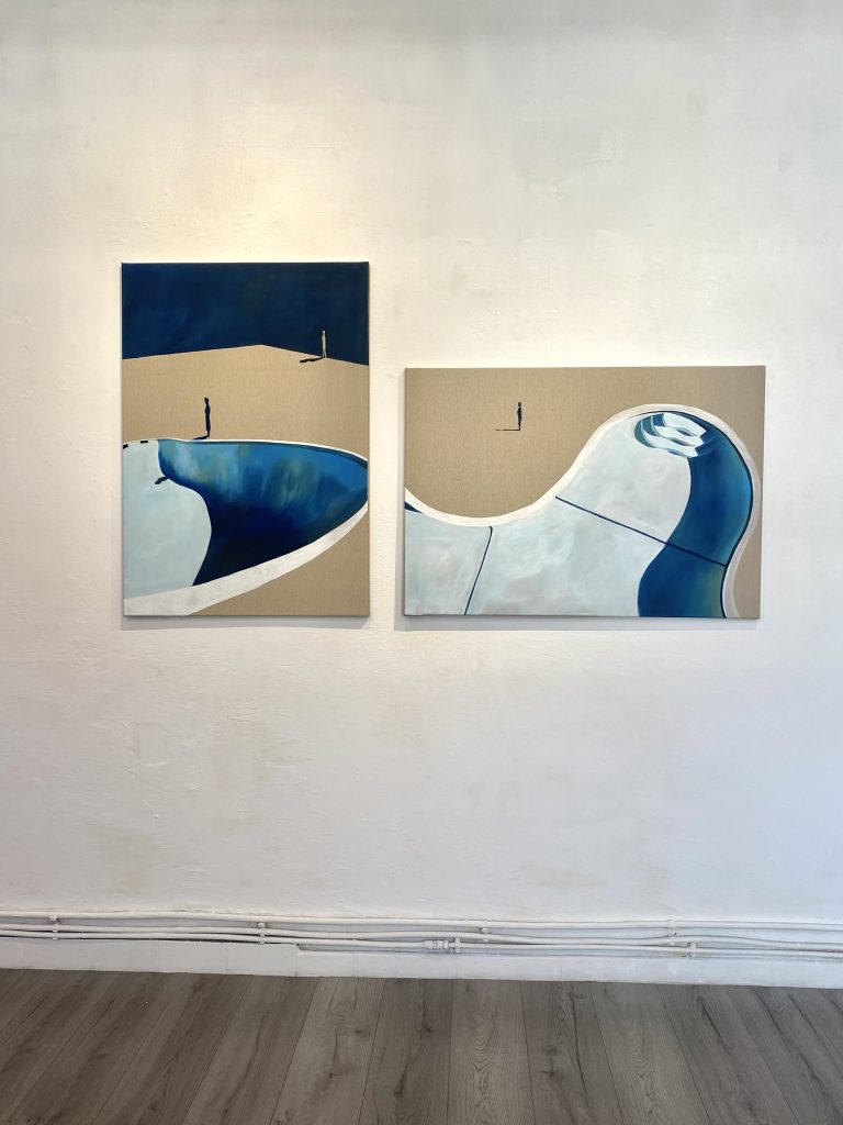 Le opere di Sofia Fresia in questa nuova miniserie nascono con l’intento di riflettere su alcune dinamiche che caratterizzano i rapporti interpersonali ai giorni nostri. Utilizzando una figurazione semplice, ai limiti del geometrico, dove raffigurano figure umane isolate, immerse in spazi sospesi, spesso di fronte a piscine svuotate, metafore di una mancanza, di un vuoto relazionale. Questi dipinti presentano scenari immaginari in cui titolo, contesto e personaggi contribuiscono a delineare alcune caratteristiche o situazioni che hanno a che fare con le difficoltà delle relazioni umane all’interno della società delle immagini e del consumo. Per un nuotatore la piscina vuota è inutile, mentre al contrario è perfetta per lo skater; in una società così variegata, tantissime cose e situazioni possono avere questa doppia valenza, e sta a noi riconoscerle.