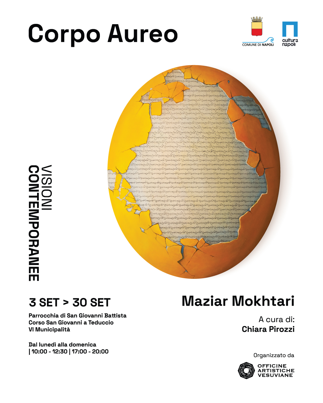 L’artista iraniano Maziar Mokhtari arriva a Napoli a settembre per una mostra site-specific dal titolo “Corpo Aureo”. Allestita negli spazi della Chiesa di San Giovanni Battista, nel quartiere San Giovanni a Teduccio di Napoli, questa personale di Mokhtari è prodotta dall’associazione Officine Artistiche Vesuviane e curata da Chiara Pirozzi.