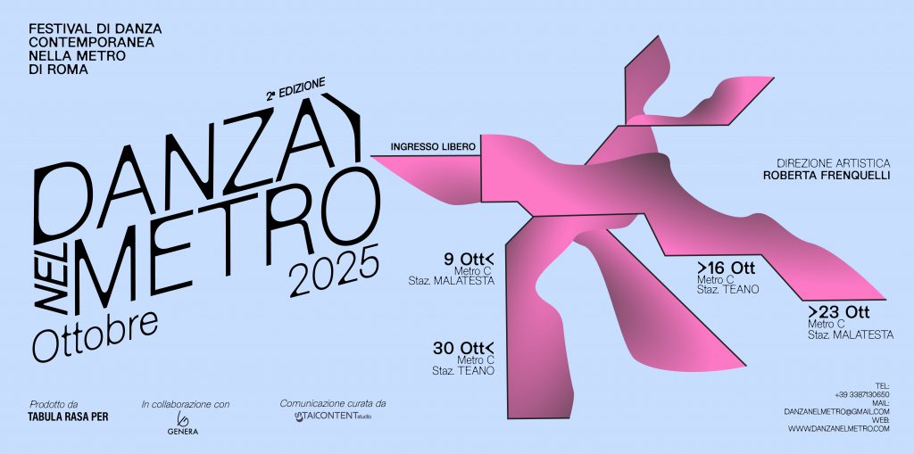 Nato nel 2024 con il sostegno di Roma Capitale (vincitore dell’Avviso Pubblico Lo spettacolo dal vivo fuori dal centro – 2024 promosso da Roma Capitale), il festival è curato quest’anno dall’Associazione Culturale Tabula Rasa Per con la direzione artistica di Roberta Frenquelli. Alla sua seconda edizione, Danza nel Metró si conferma un appuntamento urbano, gratuito e inclusivo, capace di far emergere le voci di compagnie affermate ed emergenti, invitando i cittadini e i viaggiatori della metro a fermarsi, osservare ed emozionarsi. I passi di danza rompono la frenesia quotidiana delle metro e invitano i passeggeri a rialzare lo sguardo, riscoprendo la bellezza anche nei luoghi più anonimi della città.
