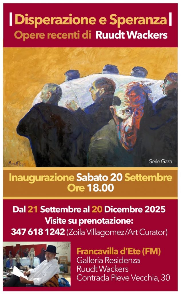 Organizzata dalla Art Manager ecuadoriana Zoila Villagomez, si inaugura il 20 settembre una mostra di opere recenti di Ruudt Wackers. In esposizione anche opere pittoriche ispirate dai tragici eventi di Gaza, da qui il titolo della mostra “Disperazione e Speranza”. L’esposizione sarà allestita a Francavilla D’Ete (FM) nella Galleria Residenza Ruudt Wackers in via Pieve Vecchia, 30. E’ visitabile su prenotazione dal 21 Settembre a 20 Dicembre 2025.