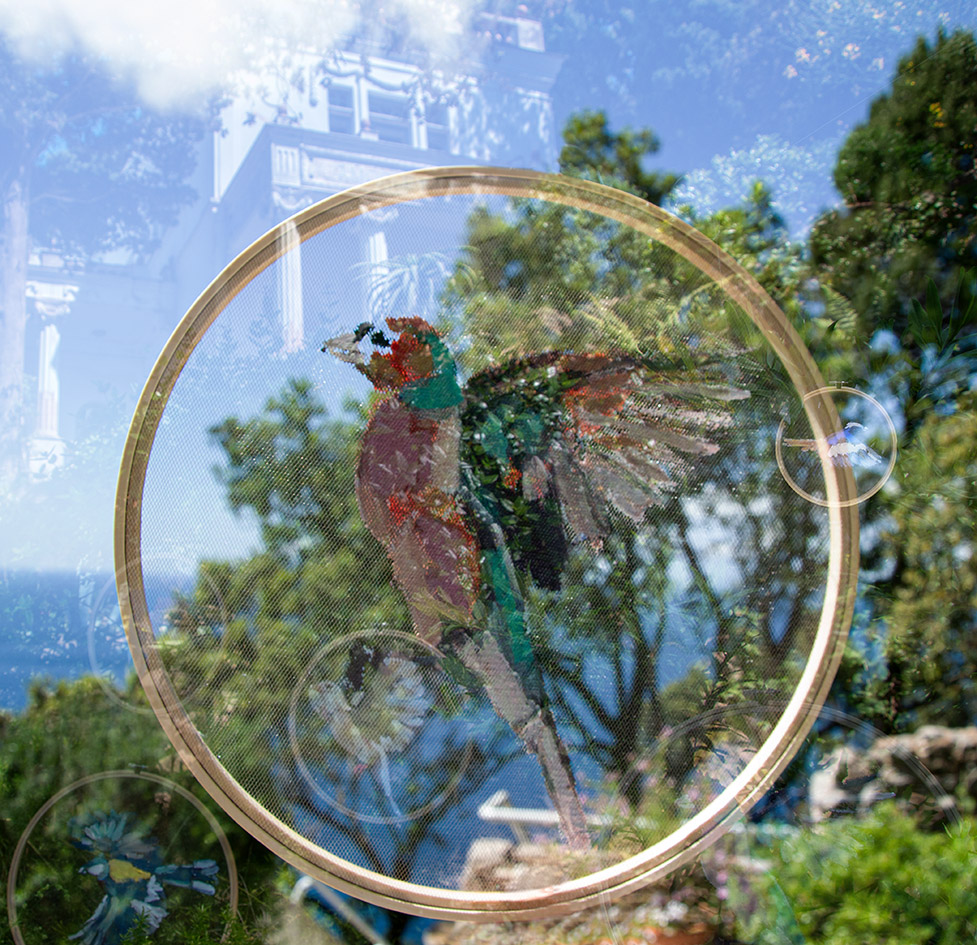 Circa 200 uccelli sospesi, ognuno dipinto a mano su tulle ed incorniciato in telai da ricamo, divisi in gruppi di sequenze. Le dieci specie scelte sono rappresentate da circa 20 fotogrammi che riprendono il principio dell’animazione tradizionale, restituendo l’illusione di un volo in movimento, di un passaggio vitale tra stasi e libertà.