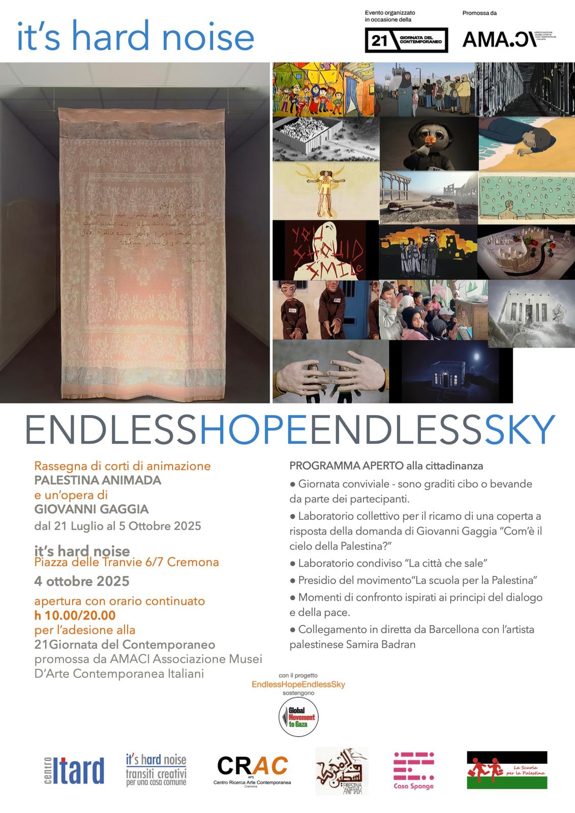 In occasione della 21 Giornata del Contemporaneo del 4 Ottobre, it’s hard noise, sarà aperto dalle 10.00 alle 20.00, con un programma accessibile alla cittadinanza. Trascorreremo una giornata conviviale, si attiveranno due attività di laboratorio collettivo: uno per il ricamo con fili d’oro di una coperta a risposta della domanda di Giovanni Gaggia “Com’è il cielo della Palestina?”, l’altro laboratorio “La città che sale", condotto da bambini e ragazzi, vedrà la costruzione di un luogo di pace immaginifico e accogliente.