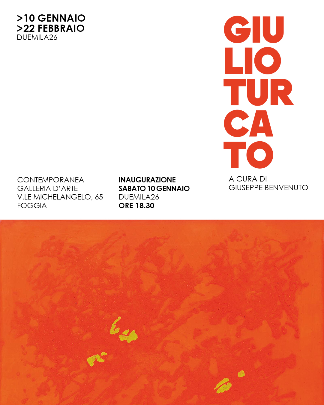 Contemporanea Galleria d’Arte di Giuseppe Benvenuto ha selezionato con cura opere rappresentative dell’artista, dal risultato della ricerca dello spazio e gesto pittorico, ai colori accesi alle diverse sperimentazioni dei materiali come sabbia, gommapiume e impasti materici.