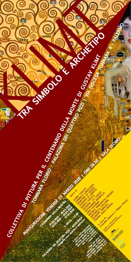 Venerdì 23 marzo, alle ore 18,30, presso Casa Florio-Tonnara Florio a Palermo, verrà inaugurata la collettiva: "Gustav Klimt tra simbolo e archetipoideata da Graziella bellone e curata in collaborazione con Filippo Amara. Si tratta di un corpus di 12 tele in cui gli artisti coinvolti , ciascuno con un'opera singola e con tecniche proprie , propongono una lettura e un'interpretazione personale dei misteriosi simboli e archetipi sottesi nelle opere di Klimt di cui ricorre quest'anno il centenario della morte.Gli artisti che parteciperanno sono:Ilaria Caputo, Carmelo Caracozzo, Demetrio Di Grado, Giuseppe Di Liberto, Marco Favata, Giuseppe Lo Cascio,Alessandra Manzella,Lidia Patermo , Michele principato Trosso, Antonella Stillone, Giuseppe Tringali, Tiziana Viola Massa.