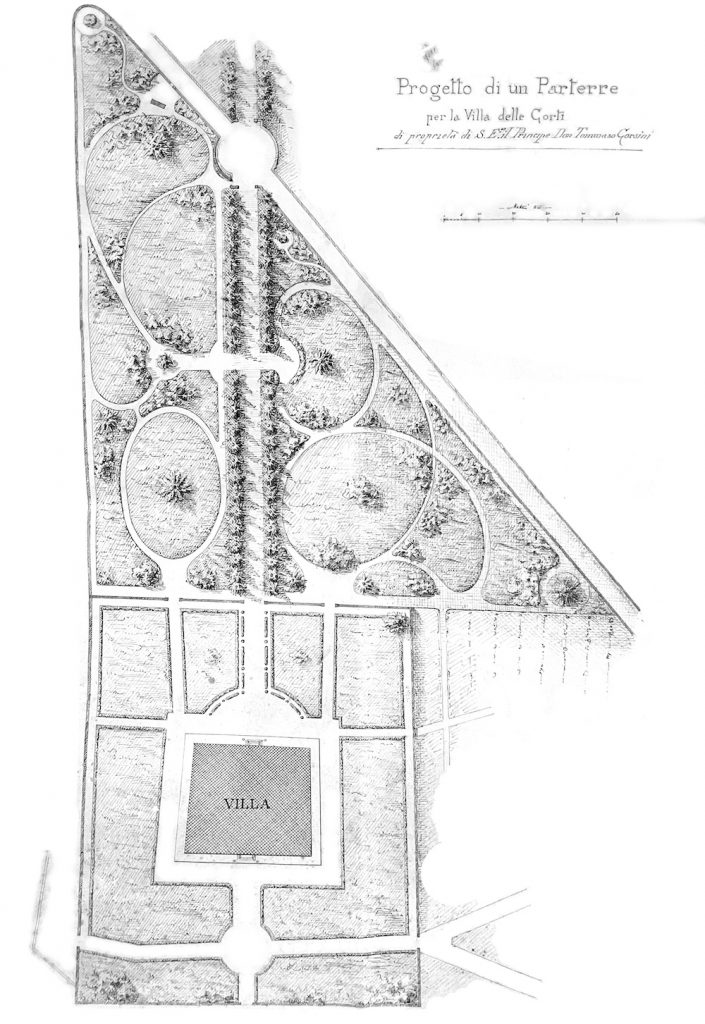 L'impianto originario, come documentano gli antichi cabrei conservati nell’Archivio della famiglia Corsini conservato al primo piano della Villa, comprendeva il grande Prato, così come lo vediamo ancora oggi, e diversi 'orti'.