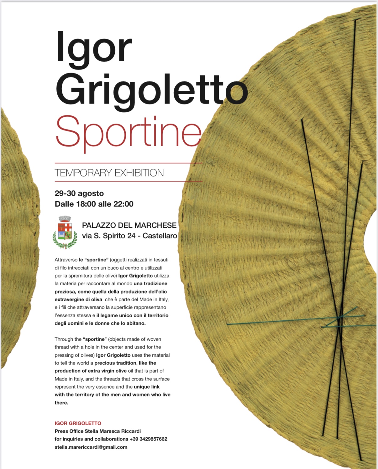Si inaugura a Palazzo del Marchese a Castellaro il 29 agosto alle ore 18 per concludersi il giorno 30, “Sportine” la Temporary exhibition dell’artista sanremese Igor Grigoletto. Protagonisti di questa personale i fiscoli, gli antichi dischi oleari che l’artista dopo aver recuperato da vecchi oleifici o dagli artigiani del territorio, dipinge con colori acrilici per poi intrecciarvi e ricamarvi le sue geometrie. Il linguaggio artistico di Grigoletto si struttura intorno ad un oggetto, un tempo di uso comune e profondamente identificativo del territorio, permettendogli di ampliarne lo spazio fisico e concettuale attraverso l’utilizzo del filo.