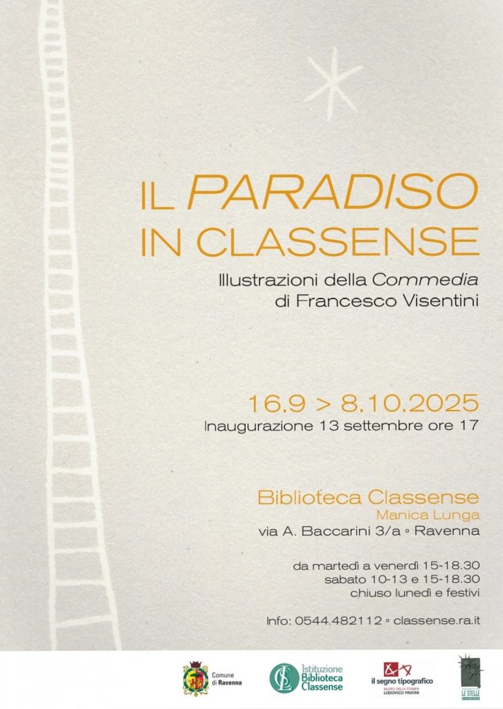In occasione del 704° Annuale della morte di Dante Alighieri, la Biblioteca Classense ospita l’opera grafica di Francesco Visentini sul Paradiso dantesco. L’artista condividerà la sua visione della terza cantica dantesca, esponendo trentatré xilografie dedicate al Paradiso insieme ad alcune delle edizioni della Commedia conservate in Classense. Questa impresa è a chiusura di un ciclo di lavoro durato cinque anni durante il quale l’artista ha interpretato in forma grafica tutta la Commedia.