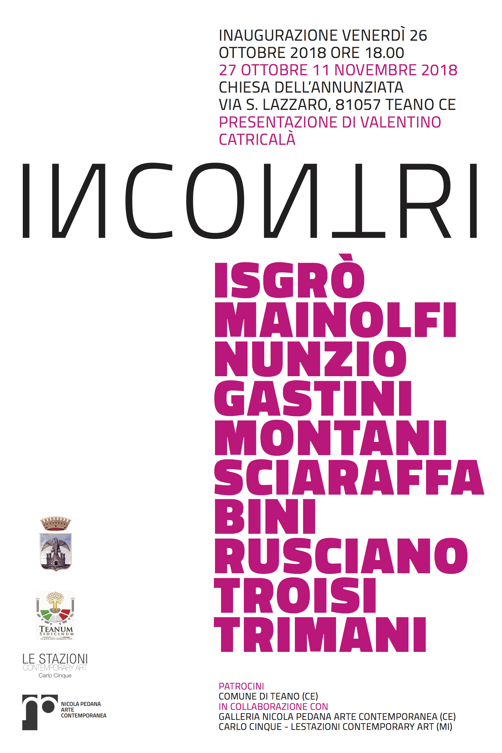 Incontri - mostra con opere di: Paolo Bini, Marco Gastini, Emilio Isgrò, Luigi Mainolfi, Matteo Montani, Nunzio, Vincenzo Rusciano, Alessandro Sciaraffa, Antonio Trimani, Ivano Troisi, presso Chiesa dell’Annunziata di Teano (CE) presentata da Valentino Catricalà