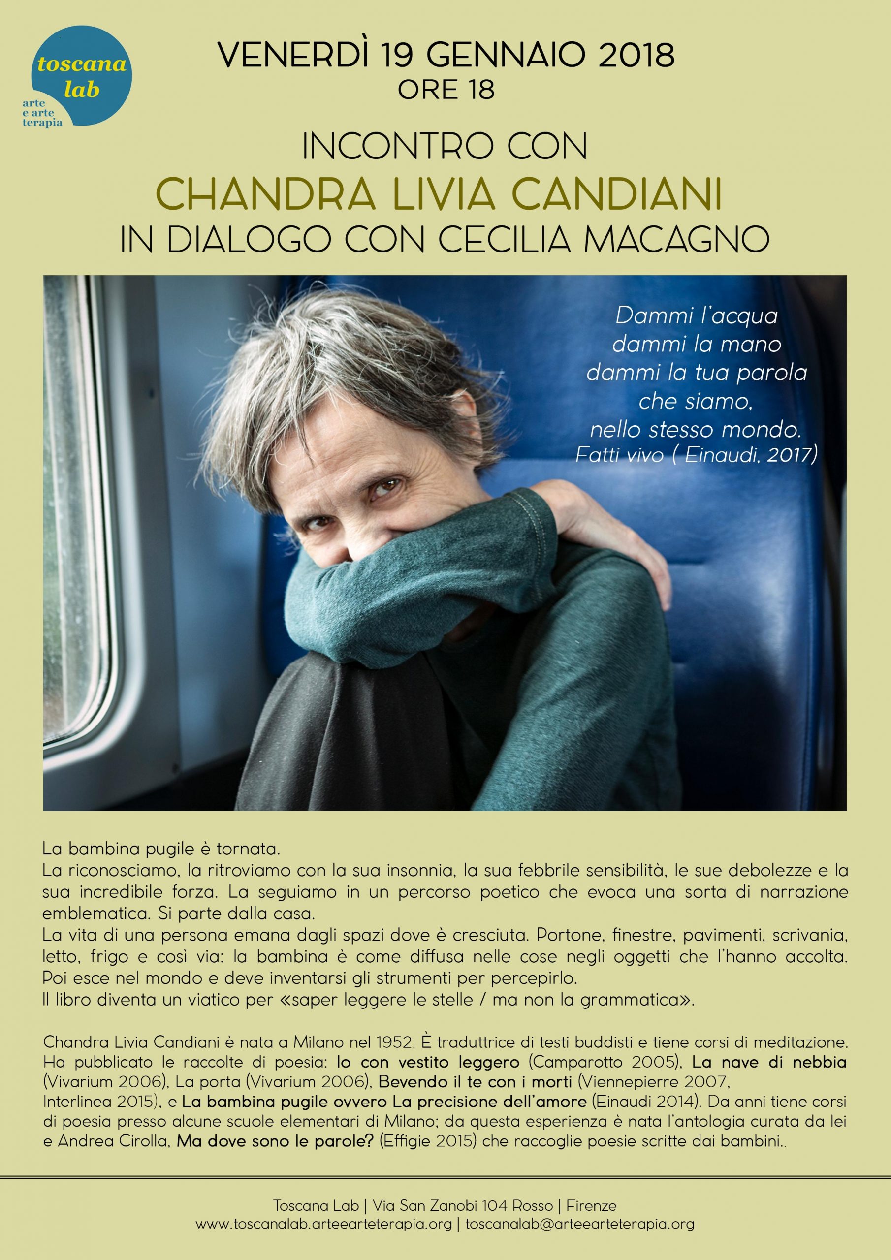 Venerdì 19 gennaio sarà l’occasione per ascoltare la poetessa Chandra Livia Candiani conversare con Cecilia Macagno, ideatrice del progetto Toscanalab.arteearteterapia di Firenze e per dialogare insieme a lei delle parole dei suoi libri "La bambina pugile- Ovvero la precisione dell'amore" (Einaudi, 2014) e "Fatti vivo" (Einaudi 2017).