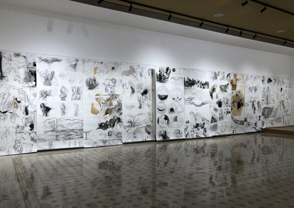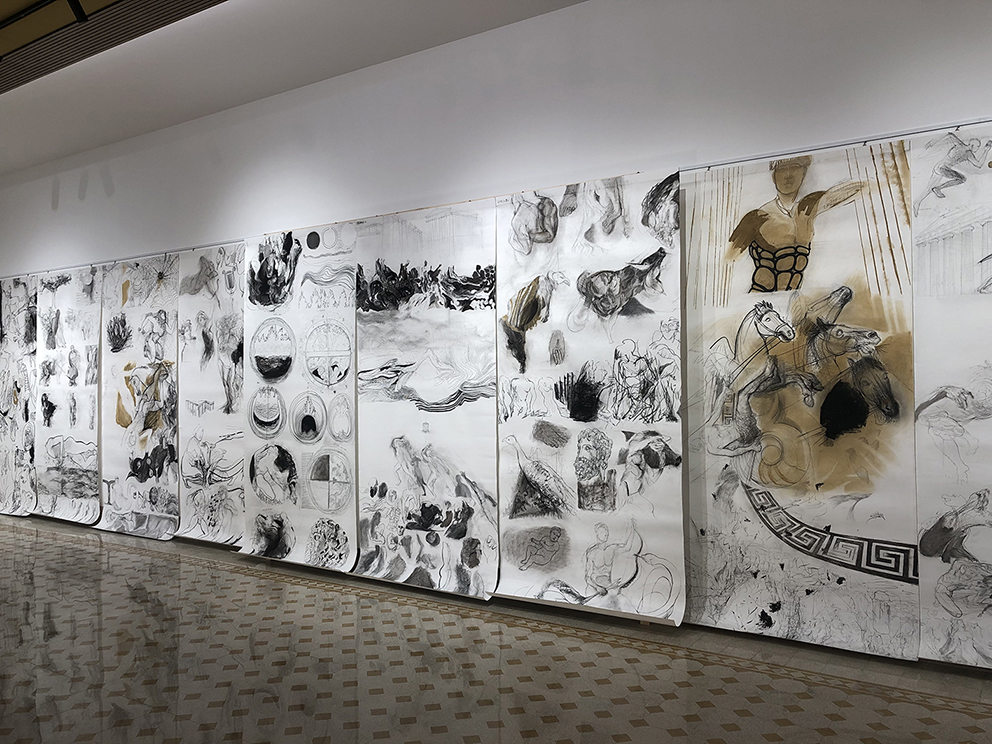 L’installazione che l’artista ha creato per l’occasione interpreta, attraverso la tecnica del disegno su carta, l’opera del poeta romano Ovidio, “Metamorfosi”, capolavoro letterario del mondo classico latino.