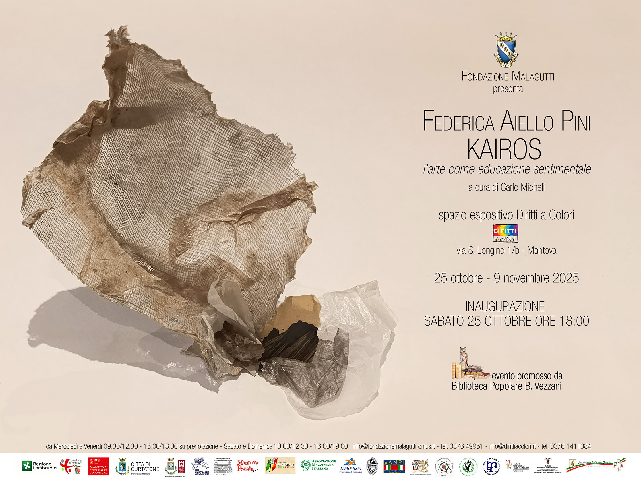 Nel progetto Kairos, Federica Aiello Pini ci invita a sostare nel tempo interiore dell’arte, dove la materia – carta, cuciture, frammenti – diventa pelle, respiro, memoria. Dal 25 ottobre al 9 novembre - spazio espositivo Diritti a Colori di Fondazione Malagutti - Mantova