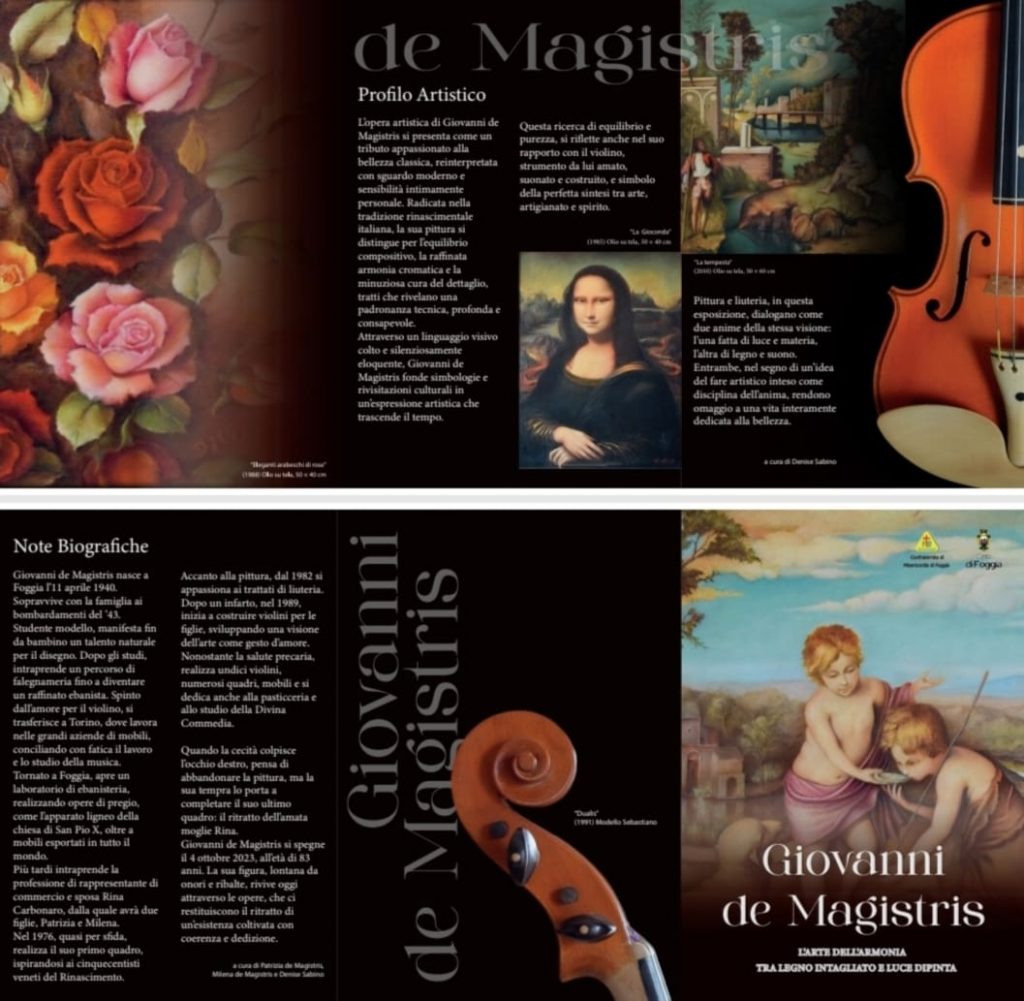 La mostra “L’arte dell’armonia tra legno intagliato e luce dipinta” è un’esposizione dedicata alla figura e all’opera di Giovanni de Magistris (1940 – 2023), artista foggiano, pittore e liutaio. Attraverso una selezione di dipinti e violini, l’iniziativa intende raccontare il percorso umano e creativo di un uomo che ha saputo trasformare il gesto artigianale in espressione artistica, coniugando con coerenza e sensibilità la pratica pittorica e la liuteria.