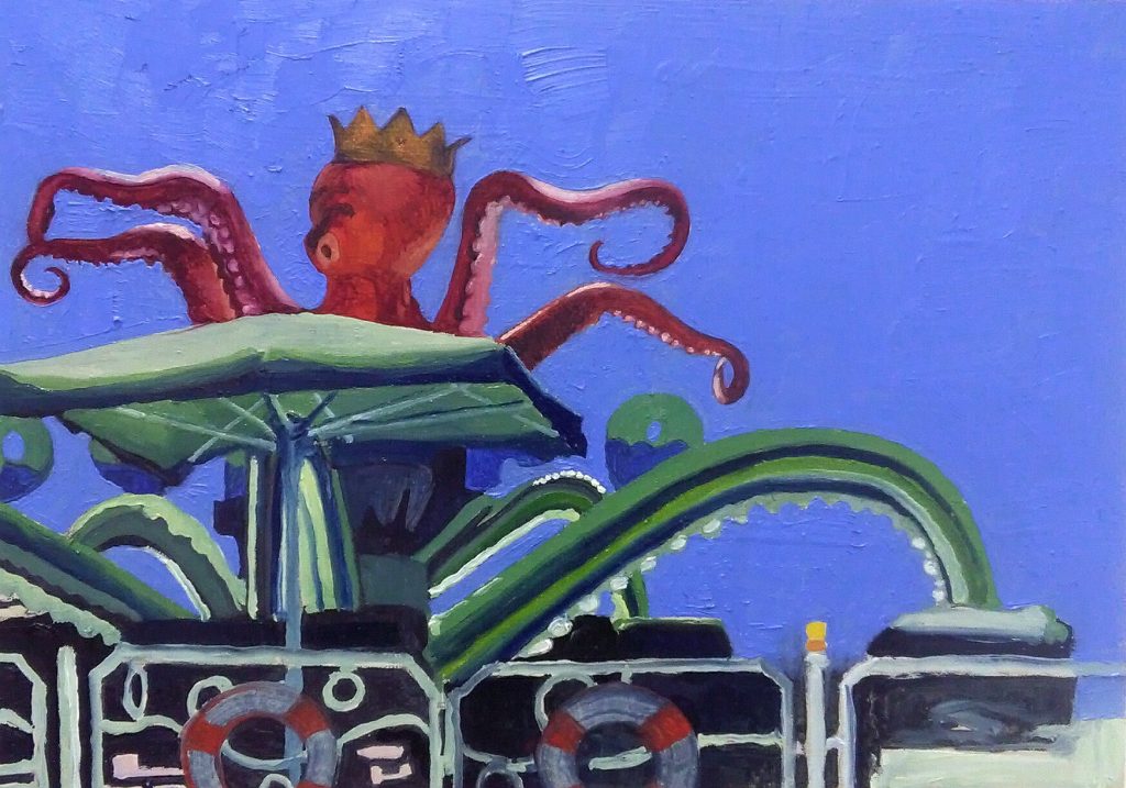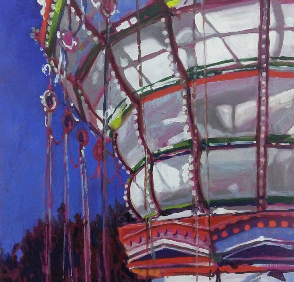 L’artista e scenografo teatrale Guido Buganza presenta una serie di dipinti site-specific sul tema del Luna Park. Una sequenza inesauribile di accostamenti cromatici dei più svariati, dove la luce impietosa, attonita e sterminata dei pomeriggi estivi sia alterna alla sontuosa artificiosità dei notturni, la cui gioia disperata appare quale celebrazione effimera delle miserie umane.