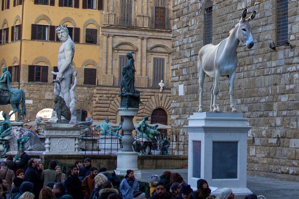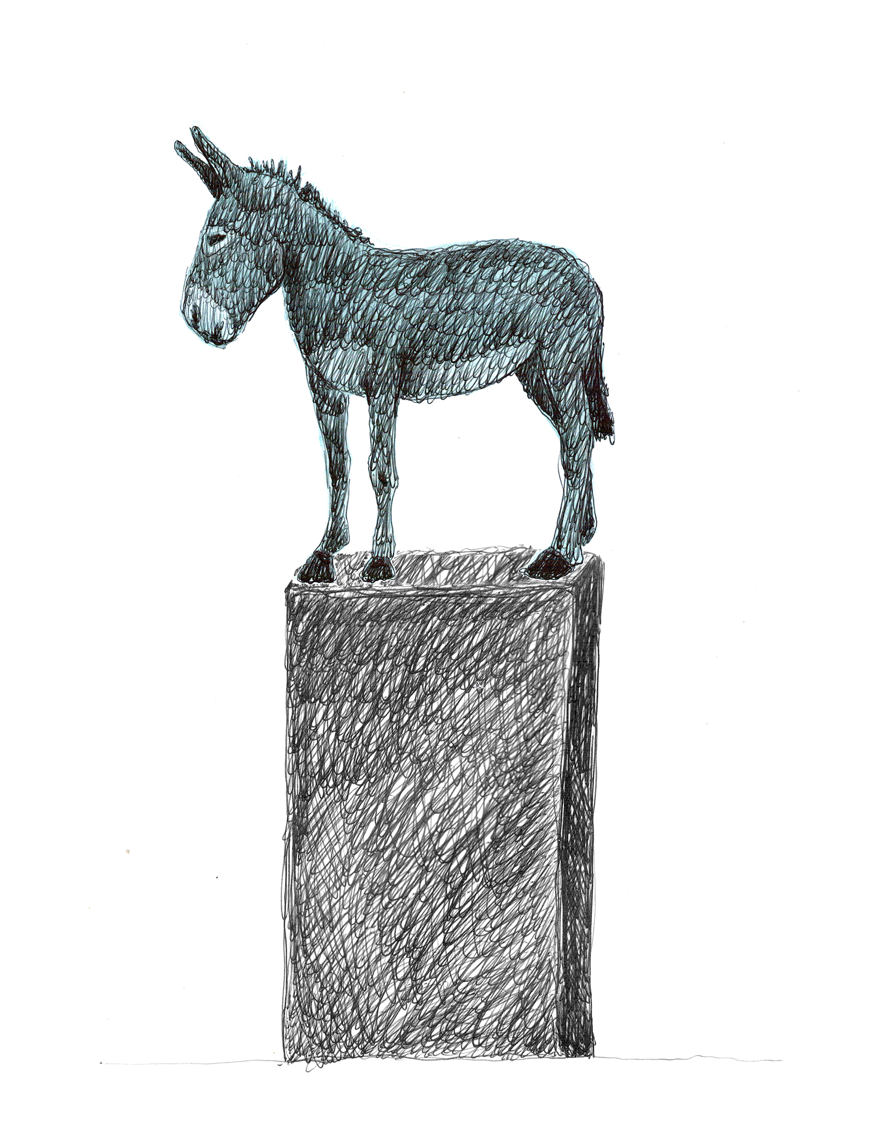 C’è nei lavori esposti un sentire intimo e umile e le opere dell’artista toscano si incentrano proprio sull’umiltà del somaro, in cerca un riscatto per il suo essere considerato ingiustamente sinonimo di incapacità, accostato —come scrive Valeria Bruni— al priapismo in maniera derisoria, una sorta di antitesi del cavallo, fiero e indomito animale dei guerrieri e dei potenti, e allora ecco che essere un somaro diventa una virtù e lui fiero e consapevole “sale” su un piedistallo e si staglia orgoglio- so nel cielo.