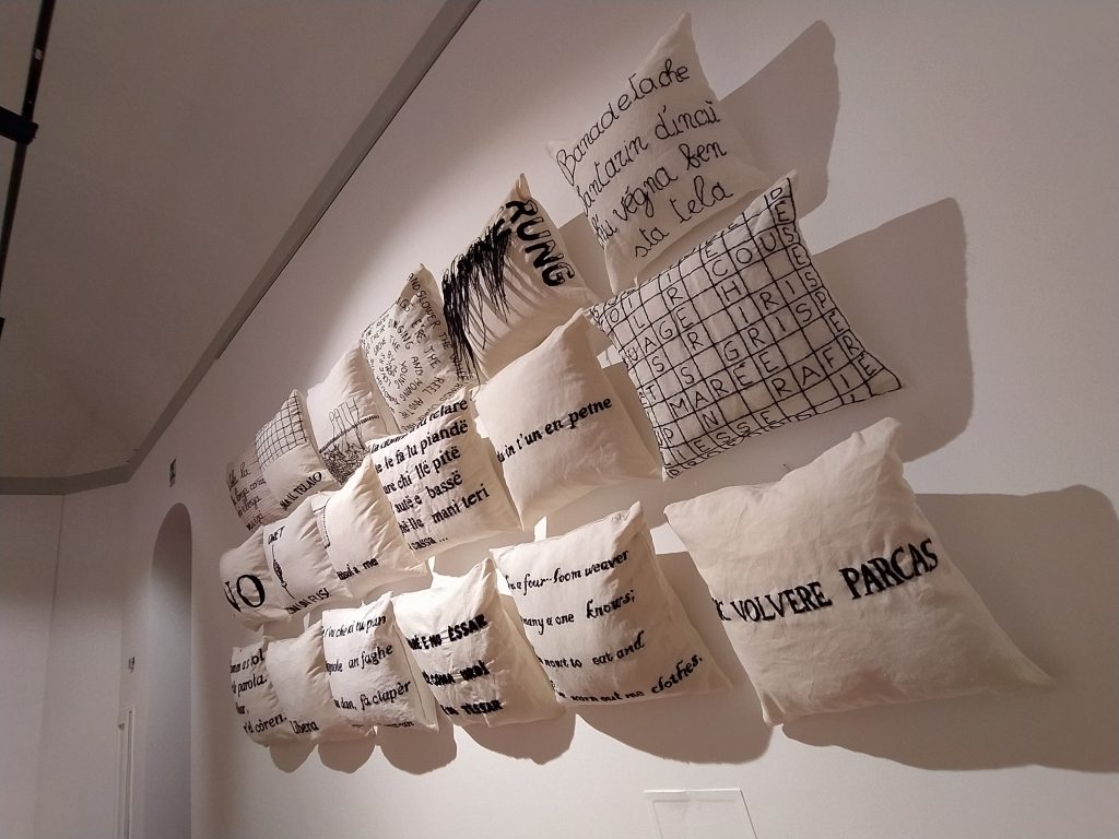 L'artista attraverso un operazione di tessitura e ricamo indaga il concetto di memoria e scrittura, in questo caso nella lingua madre, come parte fondamentale delle radici e dell’identità di una persona e patrimonio culturale intrecciato con l'intera umanità. L’artista indaga con l’annotazione e l’azione lenta del ricamo della parola sulla tela, il rapporto etimologico e fonetico del suono e dei vari significati che nel tempo creano quelle parole all’interno di stratificazioni linguistiche e di contaminazioni di vita tra diversi popoli e culture, per questo la mostra prende forma come una grande scatola del suono o del silenzio, in cui del silenzio, richiamando le sale di registrazione musicali ovattate che in questo caso sono di cuscini con scrittura da leggere, nel linguaggio verbale e tessile.