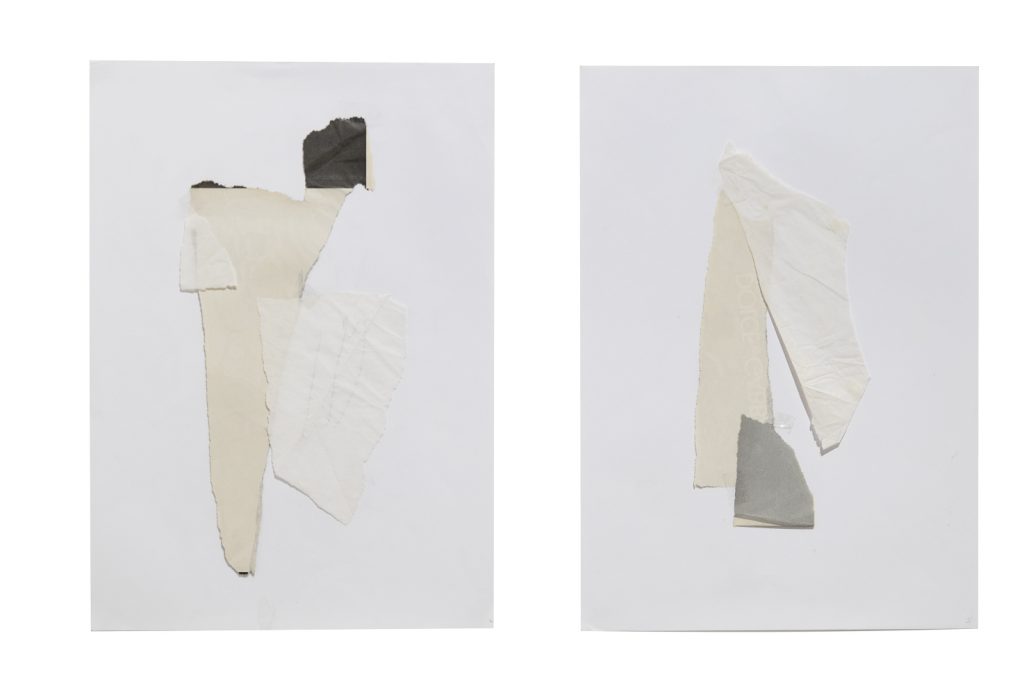 Così in punta di piedi sei accolto da Armonie, 1: nel tenue silenzio di un Oltre su cui si spalancano due finestre accostate. Esigui ritagli dai colori semi-spenti o sfumati vi si contrappongono. Ma combinati in modo da bilanciarsi fra loro: con appena due piccoli strappi- ritagli ( l’uno nero in alto a sinistra, l’altro grigio in basso a destra), due pesi piuma chiamati a reggere in un perfetto quanto fragile equilibrio la bilancia stessa del mondo.