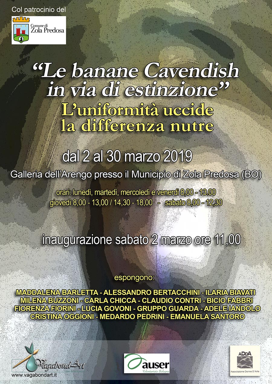 Presentiamo a Zola Predosa "Le banane Cavendish in via di estinzione" l'uniformità uccide la differenza nutre.Un nuovo progetto artistico che affronta il problema della sempre maggiore contrazione della varietà delle specie viventi animali e vegetali a causa della selezione attuata per motivi esclusivamente economici;capita così che suoni un allarme scientifico che riguarda le banane Cavendish,la specie più coltivata (il 95% della produzione mondiale è la monocultura Cavendish),più venduta e consumata nel mondo.Le banane,quindi,rischiano di sparire dalla circolazione:un invincibile fungo ha colpito questa varietà che non ha la possibilità di difendersi.Da qui parte la nostra scelta motivazionale ed artistica: mettere in luce la negatività dell’uniformità che in questi tempi si ricerca in ogni aspetto della vita.Questo muoversi verso l’omologazione produce “cloni” umani, animali e vegetali,infine dà un falso senso di sicurezza,suscita la paura di ciò che è “diverso",ma la storia e l’arte insegnano che la ricchezza si coglie nella diversità.