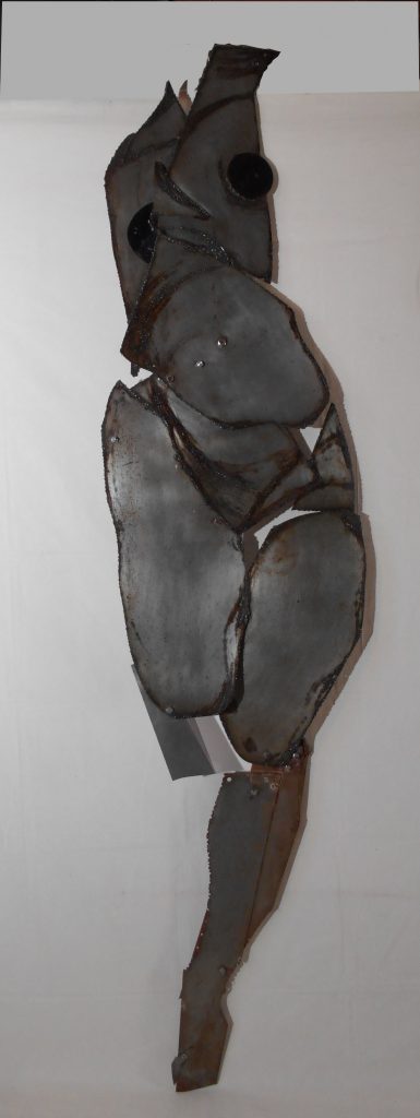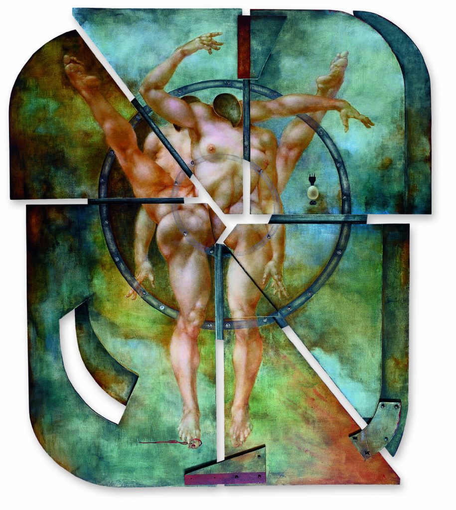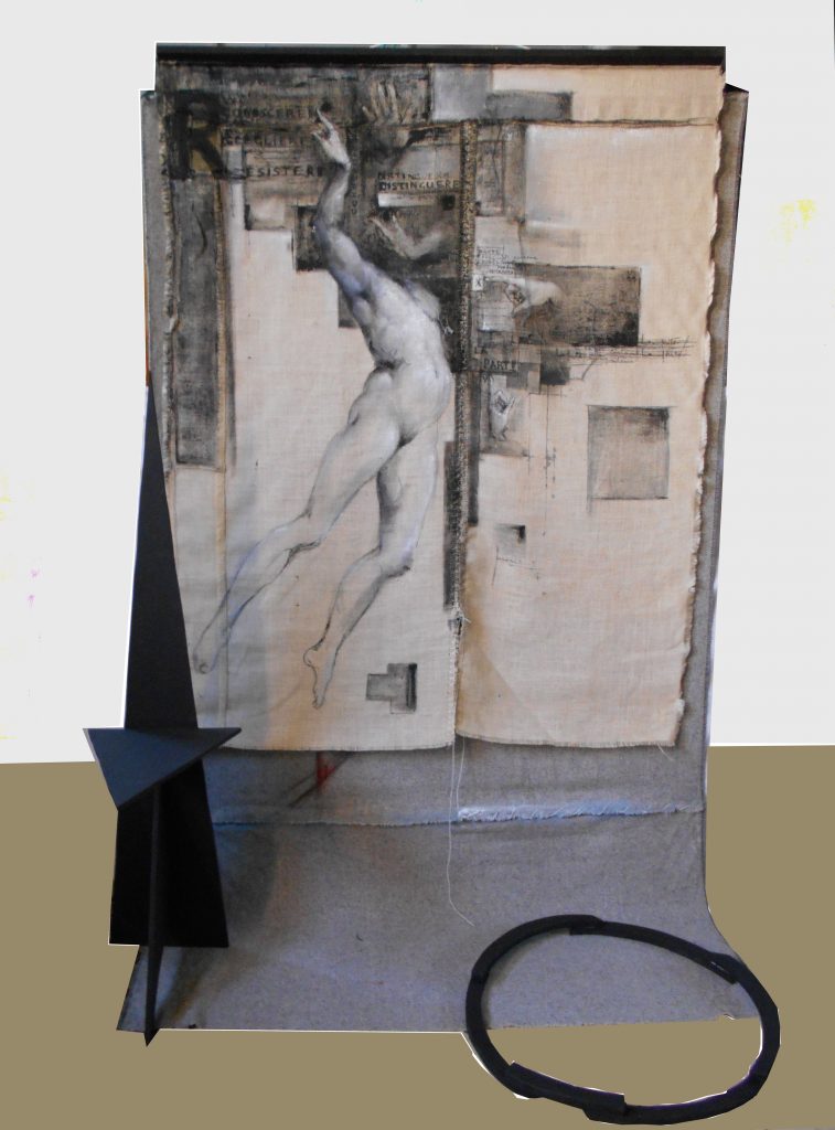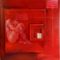 L'allestimento prevede tele/installazioni dipinte (bianco e nero, senza preparazione di fondo e non incorniciate) che avvolgono piccoli/medi dipinti, su tavola, dove domina il colore rosso. Tavole policrome a parete o assemblate in strutture in ferro. Nelle vetrine opere su rete, trasparenti, e sculture in ferro.