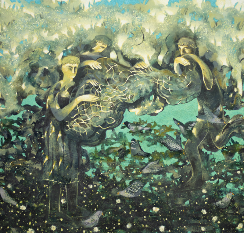 Ceccherini non cerca una narrazione lineare, ma la forza di un’impressione: un paesaggio interiore e condiviso, capace di evocare più che di raccontare. La sua pittura, densa e fumosa, amalgama figure e scenari in immagini quasi mitiche, illuminate da bagliori fluorescenti e tonalità cupe, come un racconto popolare sospeso tra fiaba e mistero. Le opere non offrono una lettura univoca, ma invitano lo spettatore a un’osservazione ravvicinata, alla scoperta lenta dei dettagli, dove riaffiorano segni e simboli di matrice medievale.