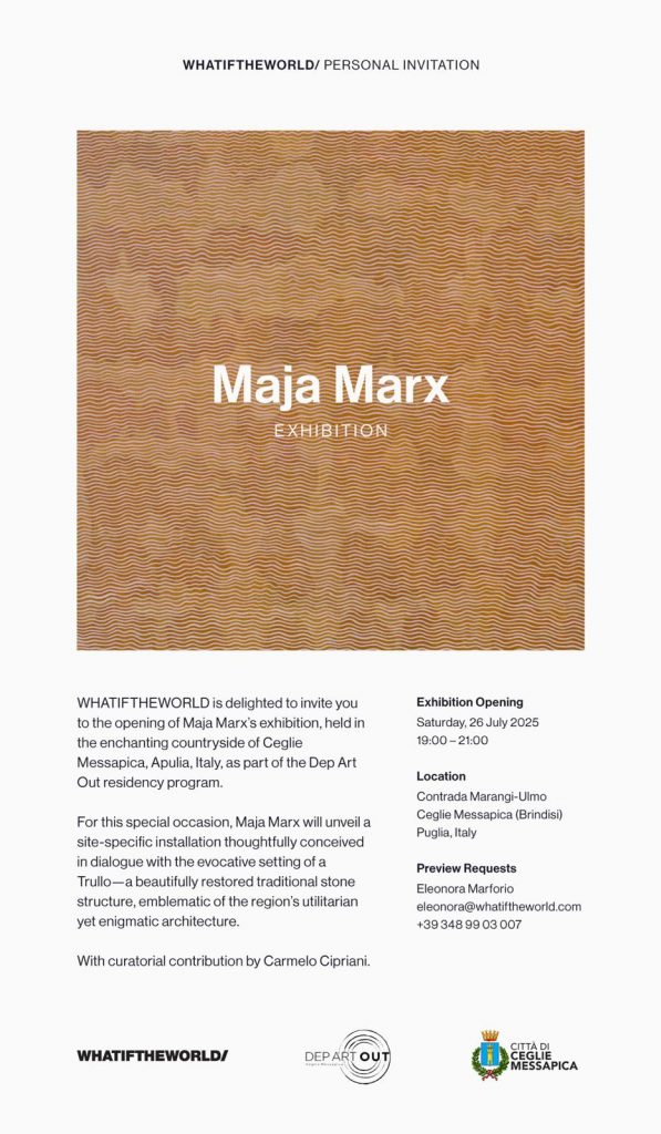 Per questa speciale occasione, Maja Marx presenterà un'installazione site-specific, concepita appositamente per dialogare con la suggestiva cornice del trullo, una struttura tradizionale in pietra splendidamente restaurata, emblematica dell'architettura e della storia della regione. Un'opera che attraverserà per intero il trullo fino a riformularne la spazialità interna, sondando al contempo le possibilità installative della pittura. Il lavoro incarna il concetto di narrazione che si dispiega, evocando un viaggio nel tempo e nel paesaggio.