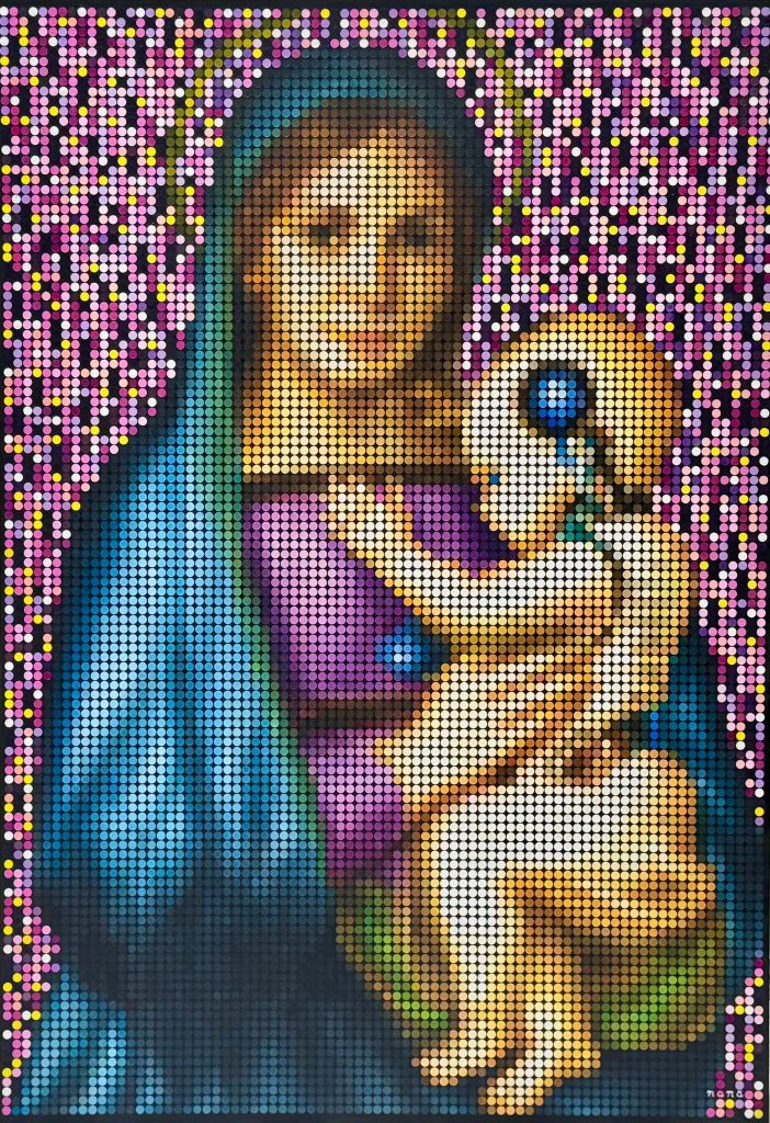 Nato da una famiglia di artisti italiani, MaMà Dots ha ideato il linguaggio del Pop Pointillism, una tecnica pittorica in cui migliaia di punti a olio, dipinti a mano, evocano l’estetica digitale dei pixel, riaffermando la centralità del gesto umano nell’epoca dell’intelligenza artificiale.