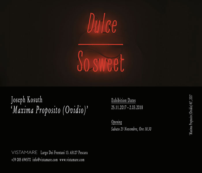 La nuova mostra di Joseph Kosuth alla galleria Vistamare di Pescara è basata sul lavoro di Ovidio. Questa è la prima volta che l’artista si confronta con il poeta romano, nato a Sulmona vicino Pescara, e contemporaneo di Orazio e Virgilio. Kosuth si appropria di una serie di testi di Ovidio scritti durante il regno d’Augusto, apogeo della civiltà romana, un’epoca colta, cosmopolita e sofisticata. L’artista presenta una selezione di scritti in inglese e in latino che costituiscono assieme un’istallazione site-specific che percorre le quattro stanze della galleria.