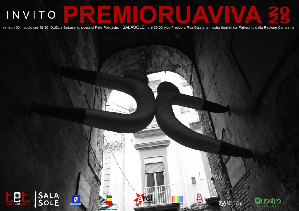 Venerdì 30 maggio alle ore 19:30 presso la Sala Sole, in Vico Freddo a Rua Catalana n. 4, nel cuore del centro storico di Napoli sarà inaugurata la Mostra Rua Viva che raccoglie le 7 opere finaliste selezionate dall’omonimo Premio diretto da Federico Adriano Borreca. L’iniziativa, patrocinata dalla Regione Campania, dal Comune di Napoli, da Arci Campania e da Antinoo Identità Libere, è realizzata grazie alla storica Associazione Culturale Taverna Est ETS e si propone come un’importante occasione di promozione dell’arte contemporanea indipendente e di valorizzazione urbana.