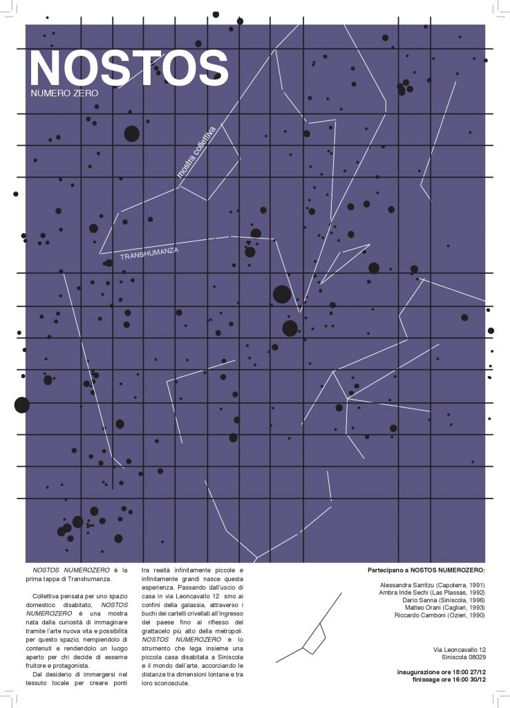 NOSTOS NUMEROZERO è una mostra collettiva pensata per uno spazio domestico disabitato da diversi anni, una mostra temporanea nata dalla curiosità di immaginare, tramite l’arte, nuova vita e possibilità per questo spazio, riempiendolo di contenuti e rendendolo un luogo aperto per chi decide di esserne fruitore e protagonista.