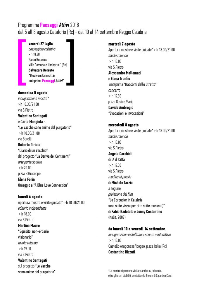 Paesaggi Attivi è il titolo che convoglierà una serie di iniziative culturali e artistiche legate ai linguaggi contemporanei: mostre, installazioni site specific, progetti di arte partecipativa, produzioni creative grafiche ed editoriali, incontri e laboratori collettivi, talk tematici, proiezioni cinematografiche e concerti. Per questa edizione gli eventi si svilupperanno oltre che nel borgo di Cataforìo – luogo natale e base operativa di Catartica – anche nel centro cittadino con incursioni-lampo in alcuni dei più importanti e significativi beni culturali e ambientali della città di Reggio Calabria: la Villa Comunale e Parco Botanico ‘Umberto I’, l’Ipogeo di piazza Italia e il Castello Aragonese.