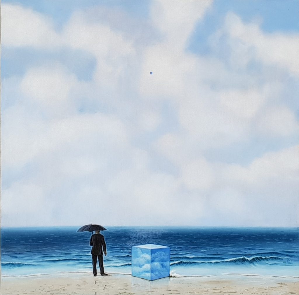 Nato a Milano nel 1950, formatosi sulle orme dei grandi maestri metafisici e surrealisti, Paolo Collini elabora rapidamente una personalissima poetica tra il visionario e un romanticismo postmoderno che lo vede sin dagli esordi muoversi nell’universo del simbolico e del surreale. Durante gli anni ottanta conquista l’interesse del collezionismo europeo e in particolare di quello tedesco, spostando la sua ricerca verso atmosfere più rarefatte e nordiche. Gli anni Novanta vedono la nostalgia aleggiare nelle sue opere e trasformare il rapporto tra vero e immaginario in Ricordo puro e mutevole, ricco di un erotismo impalpabile e oscuro, onirico e notturno. Con il nuovo millennio la sua ricerca si indirizza anche verso contesti urbani in cui l’Individuo rischia l’alienazione ma dove può ritrovare una propria dimensione in bilico tra quotidianità e fantasia.