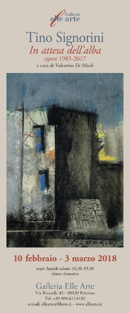 Il percorso artistico di Tino Signorini (Tripoli di Libia, 1933) è un lungo, sofferto, viatico notturno che porta alla scoperta dell’alba. La notte per lui non è il regno dell’incertezza e degli incubi, non soltanto, è soprattutto momento prediletto, quel limbo a metà tra la fine del buio e l’inizio del giorno, quando tutto tace e la mente può sorvolare indisturbata sulla realtà. La notte è la condizione necessaria affinché risorga l’alba, giorno dopo giorno, come un’araba fenice. La speranza si rigenera e la luce sorprende il buio, all’improvviso.