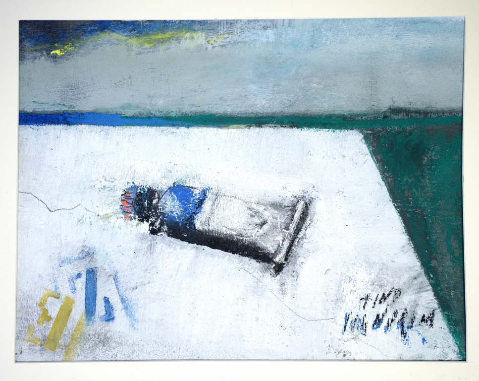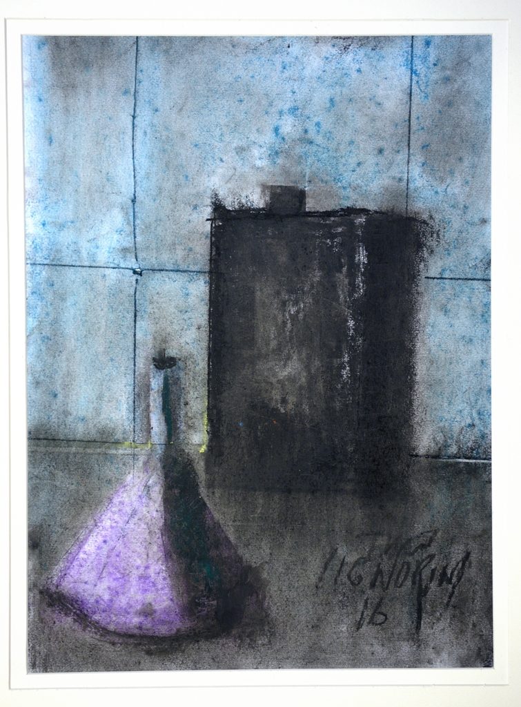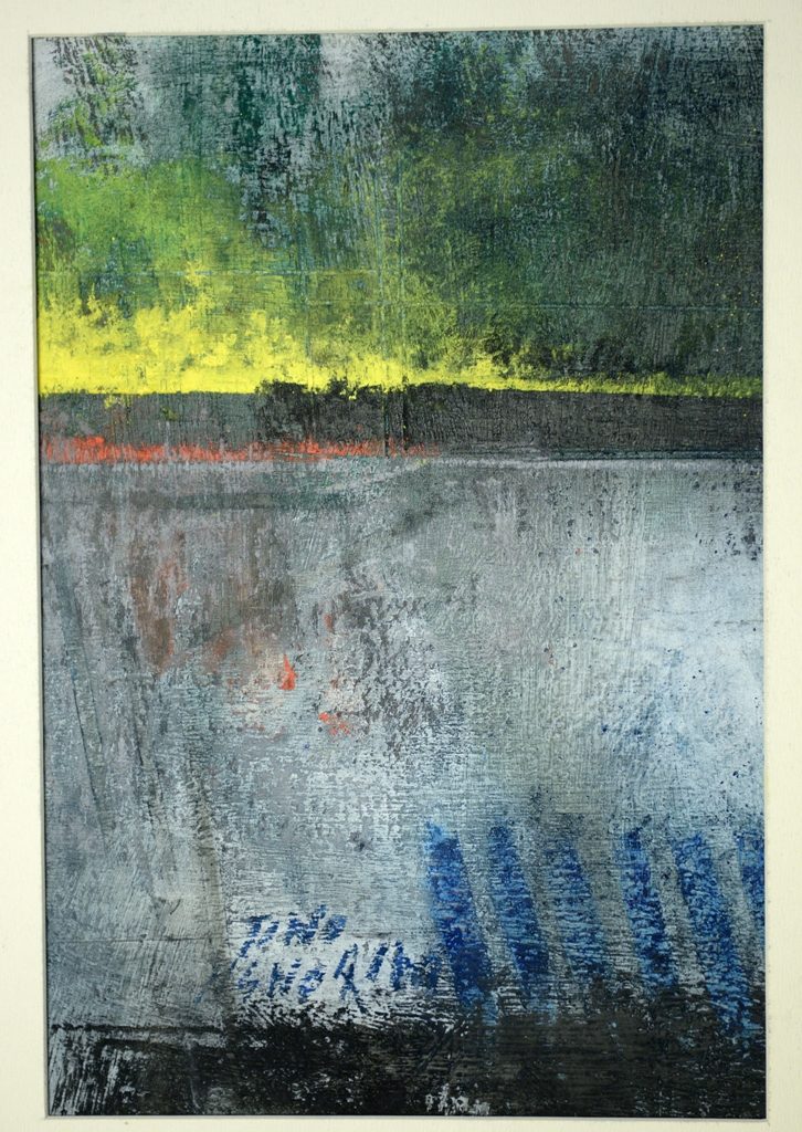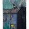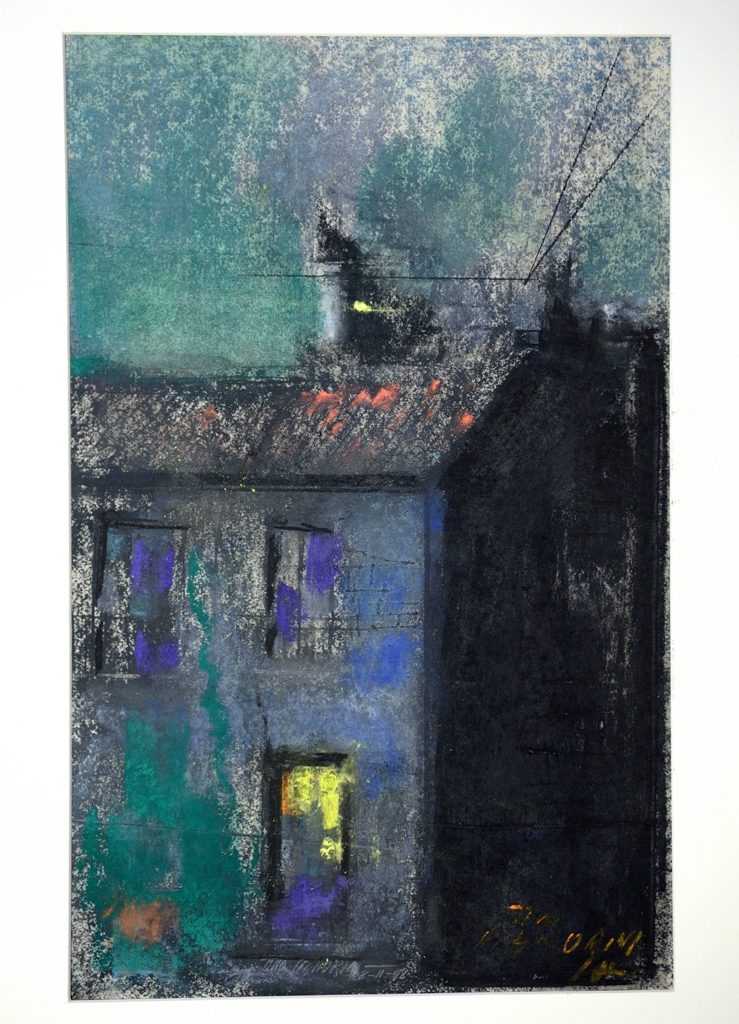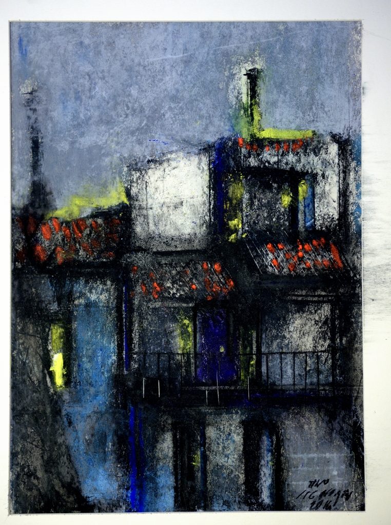 Piccolo porto, creta nera e tecnica mista su carta del 1999: è qui che dal buio della città addormentata, dalle acque di un mare nero che divide, sorge timida la nuova alba del colore, dalle tonalità pastello del cielo azzurro che si mischiano al grigiore diradandolo.