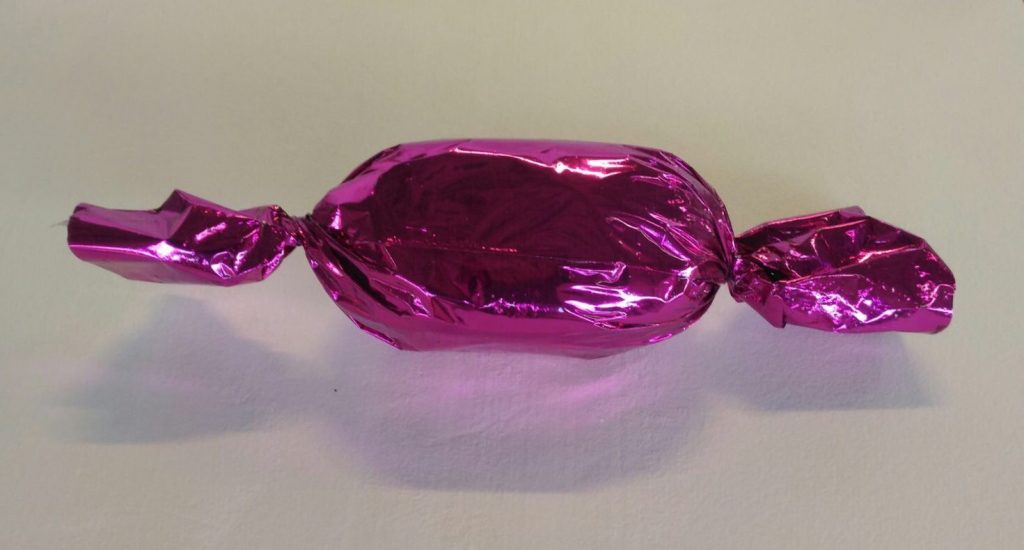 Qui, sul bordo, si innesta il lavoro concettuale di Alessandra Pierelli che aderisce, come nella migliore tradizione pop, al contesto rappresentato, quello appunto ludico dei dolciumi e delle caramelle, venendo però ad evidenziare i limiti della sua rappresentazione: mutandone la scala (per esempio la confezione gigante di macarones), ingannando l’occhio (i cioccolatini perfetti, ma di resina), oppure utilizzando la materia biologica come nuova pelle, un rivestimento organico che rivitalizza l’opera ma in altro modo (si pensi al balloon dog di Koons ricoperto di marshmallow).
