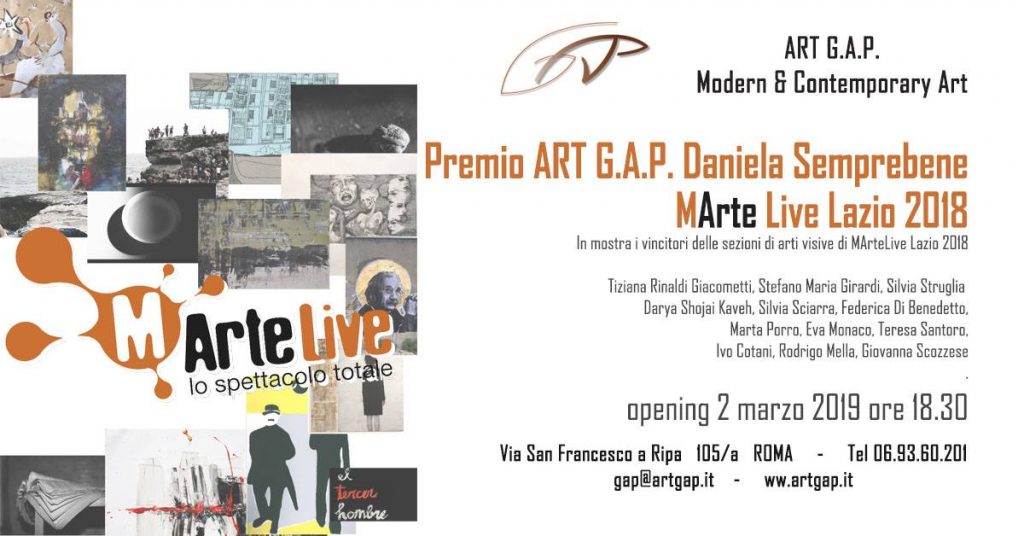 ART G.A.P. Gallery in collaborazione con MArteLive è lieta d’invitarvi il 2 marzo, alle ore 18.30, al vernissage della mostra della Prima Edizione del Premio Daniela Semprebene, a cura di Federica Fabrizi, Marco Ardizzi e Nadia di Mastropietro. Tale premio è conferito ai vincitori delle sezioni di arti visive MArteLive Lazio 2018.