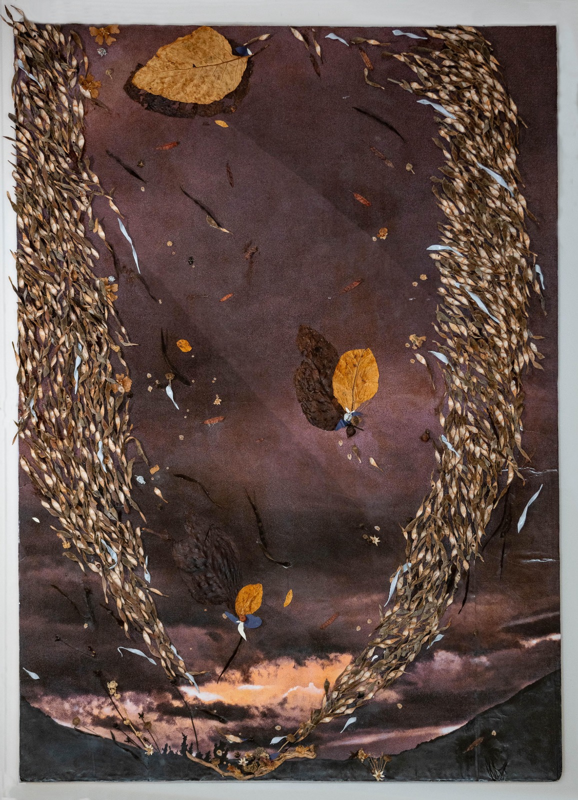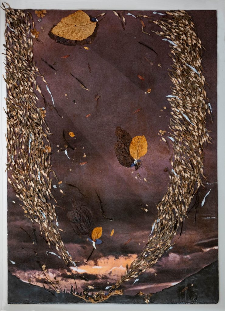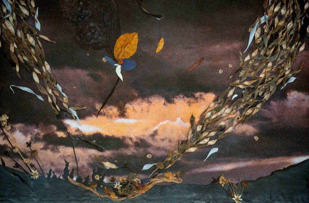 Con questo grande collage (180 x 250) l’artista ha voluto esprimere l’inquietudine della natura di fronte ai cambiamenti climatici. Su uno sfondo scenografico tempestoso, fotografato dal suo studio di Assisi e rielaborato al computer in modo da accrescere l’intensità e la drammaticità del momento, ha quindi inserito alcune delle sue essenze naturalistiche preferite tra le quali baccelli di glicine e di alberi di giuda, melograni, foglie di tabacco, fiori di altee. I baccelli di glicine, avvitati su se stessi, sono spinti in alto tra le nuvole dal vento in due grandi folate che partono dal centro della Terra dove risiedono nidi di vespe, fiori selvatici e semi di olmo tra montagne incurvate, come nel cono di un vulcano, debordando alfine anche al di là dei confini dell’opera stessa.