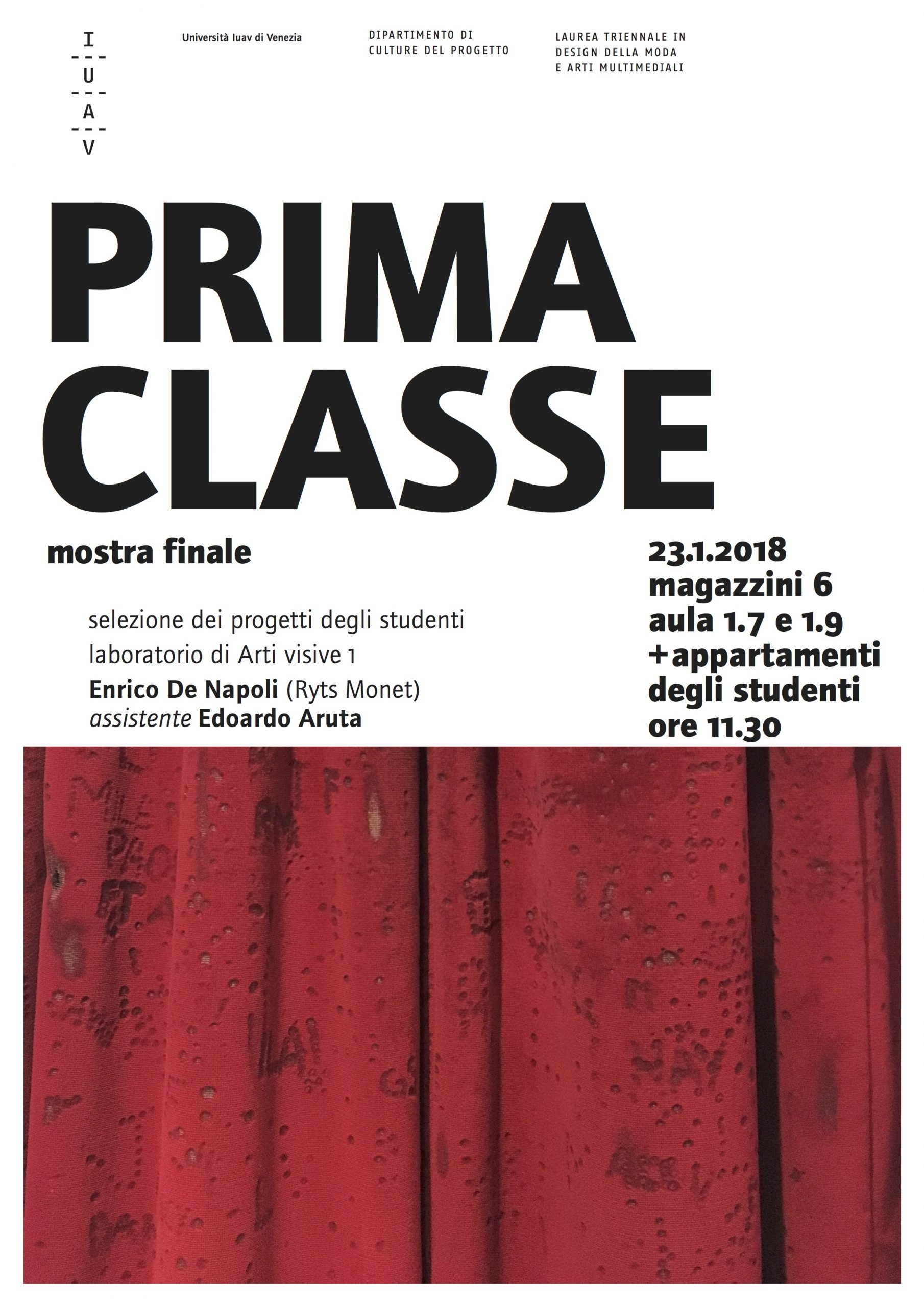 Prima Classe consiste in una selezione di progetti realizzati durante il primo laboratorio di arti visive. La mostra, aperta solo per un giorno, sarà allestita presso la sede dei Magazzini 6 dello IUAV di Venezia e in alcune abitazioni degli studenti dislocate tra i sestrieri di San Polo e Cannaregio.