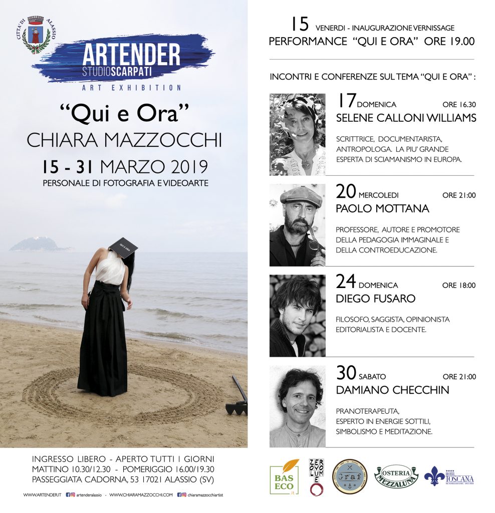 Alassio. L'artista Chiara Mazzocchi inaugura con una performance venerdì 15 marzo alle ore 19, con il patrocinio del Comune di Alassio, una mostra personale di fotografia e videoarte alla Galleria Artender di Alessandro Scarpati, in Passeggiata Cadorna 53. “Qui e Ora” è il titolo della personale dell’artista. “La presenza è uno stato che non può essere afferrato con la mente o compreso. Lo stato di presenza affiora quando la mente è incentrata sull’ Adesso, nel “Qui e Ora”. Le opere di Chiara Mazzocchi, rimarranno esposte sino al 31 marzo, con apertura della Galleria Artender tutti i giorni, mattino 10.30-12.30 pomeriggio 16.00-19.30, ingresso libero.